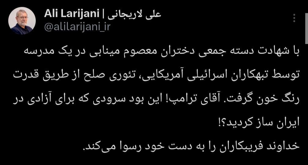 Thư ký Hội đồng An ninh Quốc gia Iran, Ali Larijani, tuyên bố rằng sau vụ tấn công dã man của Mỹ và Israel vào một trường nữ sinh khiến 171 người thiệt mạng, lý thuyết "hòa bình bằng sức mạnh" đã trở nên đẫm máu.