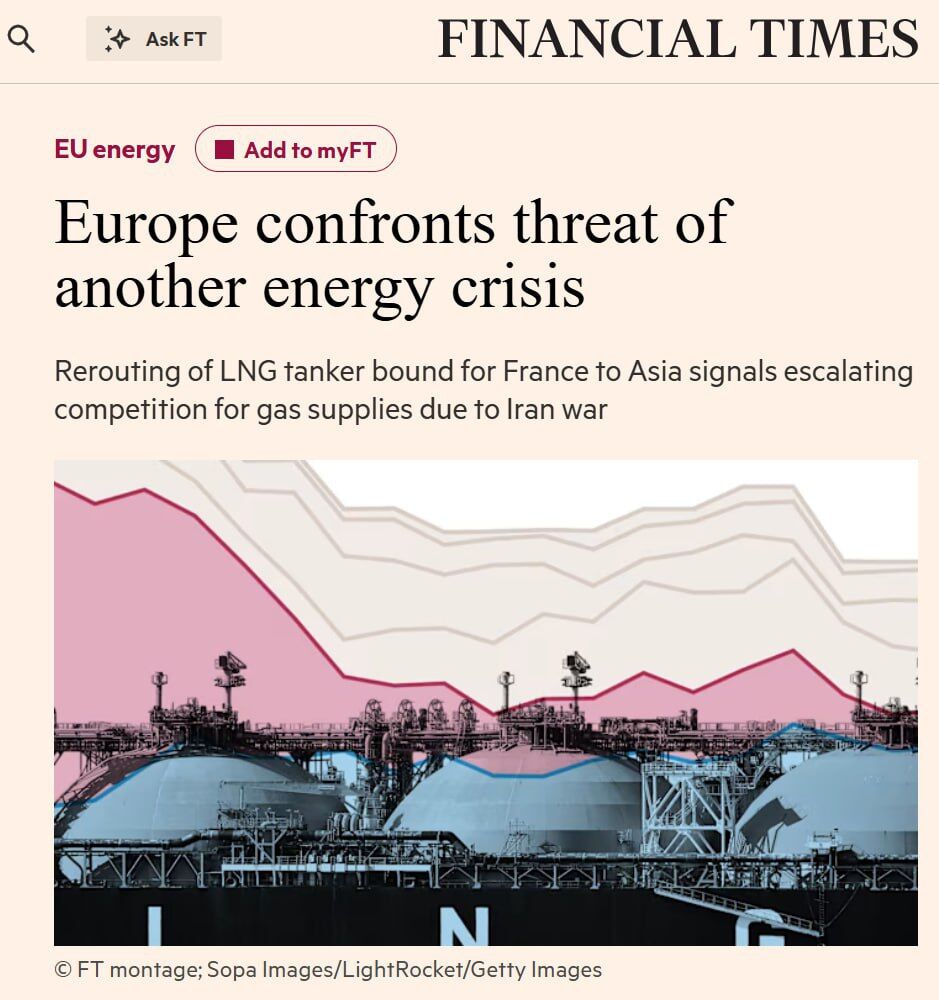Châu Âu đối mặt với cuộc khủng hoảng năng lượng mới do cuộc chiến của Mỹ và Israel chống lại Iran, — FT