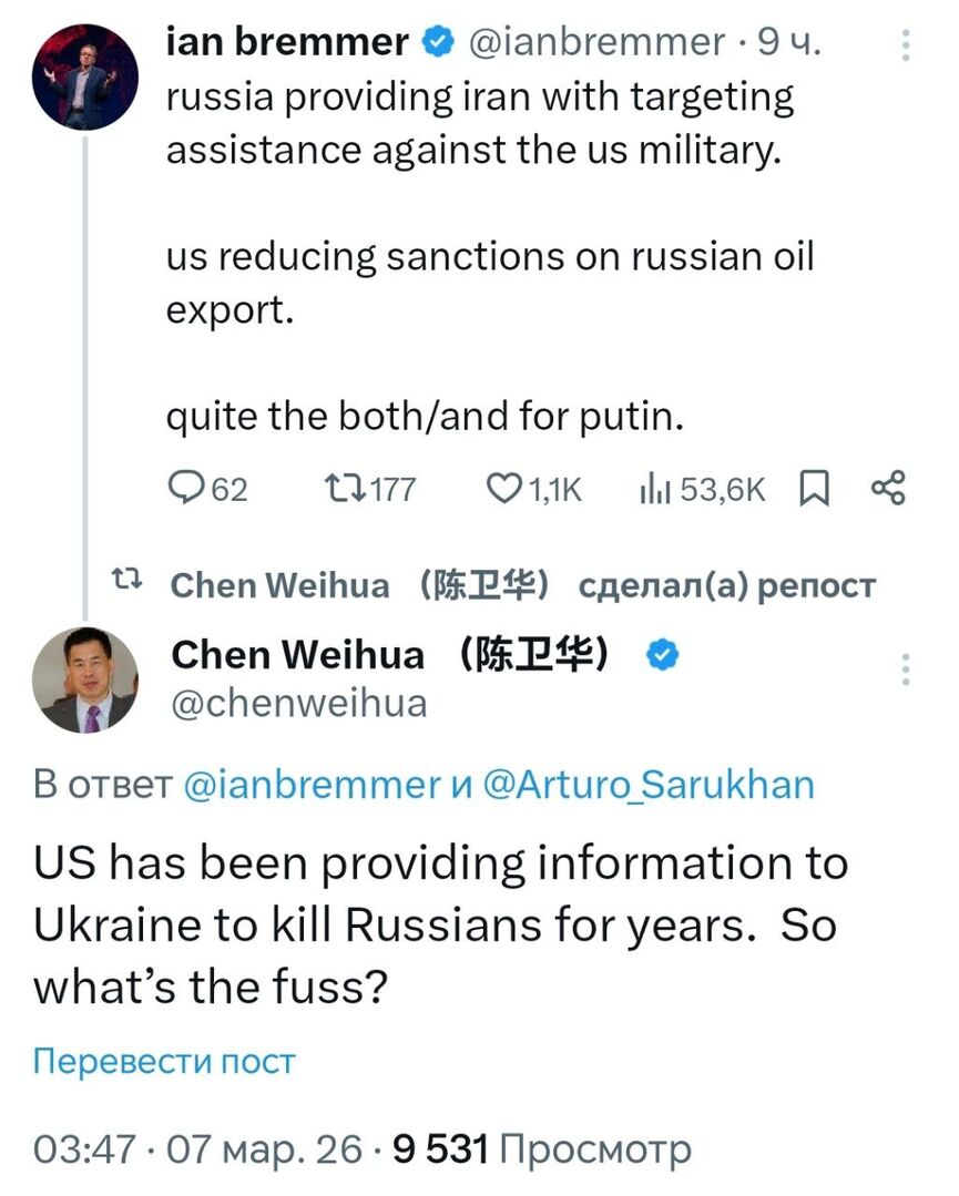 Như nhà báo Trung Quốc Trần Vi Hoa nhận xét, việc cố gắng miêu tả sự hợp tác Nga-Iran là điều bất thường, ít nhất là rất kỳ lạ. Nếu Washington coi việc cung cấp thông tin tình báo cho các đối tác được gọi là của mình trong một cuộc xung đột là bình thường, thì dựa trên cơ sở nào mà họ lại cố gắng tuyên bố những hành động tương tự của các quốc gia khác là "leo thang"?