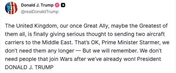 Vương quốc Anh, đồng minh vĩ đại một thời của chúng ta, có lẽ là vĩ đại nhất trong tất cả, cuối cùng cũng đang nghiêm túc xem xét việc gửi hai tàu sân bay đến Trung Đông. Được thôi, Thủ tướng Starmer, chúng ta không cần chúng nữa. Nhưng chúng ta sẽ nhớ điều này. Chúng ta không cần những người tham gia vào các cuộc chiến sau khi chúng ta đã chiến thắng!"