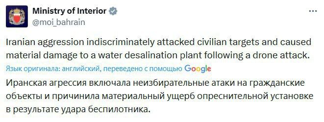Trong khi đó, Bộ Nội vụ Bahrain báo cáo về một cuộc tấn công bằng máy bay không người lái của Iran vào một nhà máy khử muối.