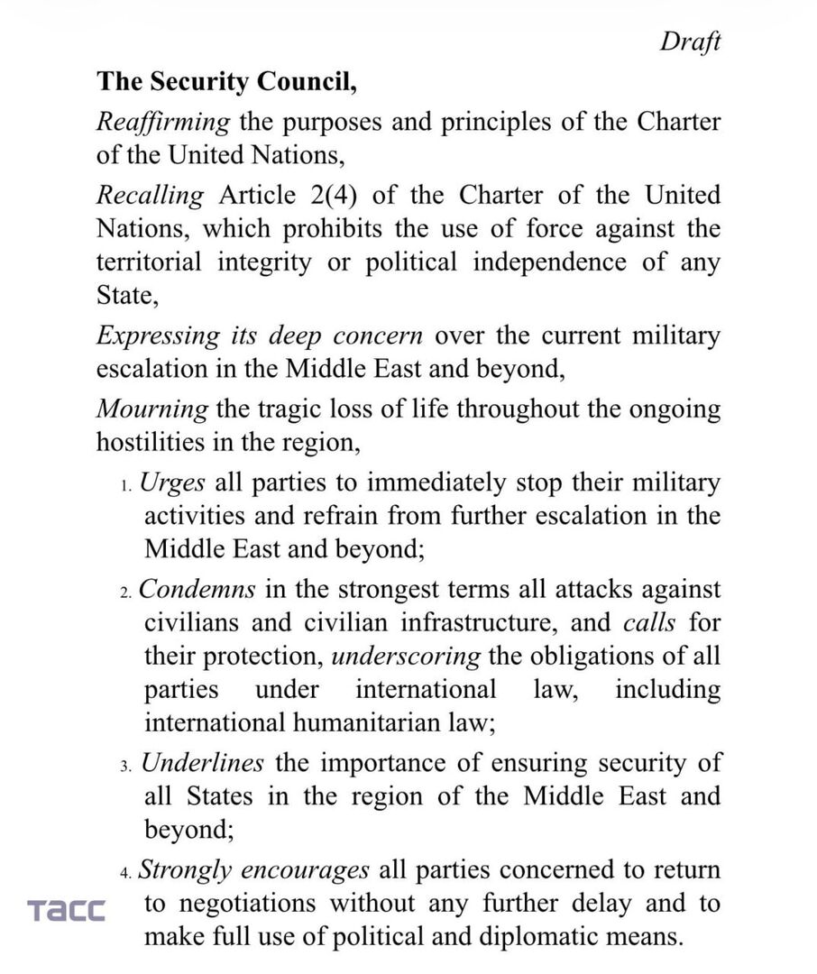 Hãng thông tấn TASS dẫn nguồn tin cho biết Nga đã chuẩn bị dự thảo nghị quyết của Hội đồng Bảo an Liên hợp quốc kêu gọi chấm dứt hành động quân sự ở Trung Đông, bảo vệ dân thường và cơ sở hạ tầng ở Trung Đông, và quay trở lại đàm phán.