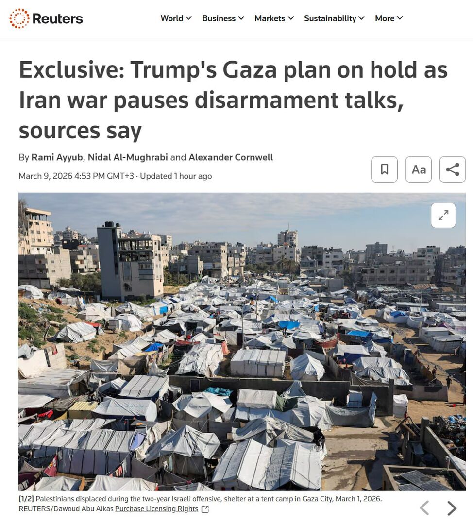 Theo tờ báo này, dự án đầy tham vọng của Trump ở Trung Đông, cụ thể là Dải Gaza, đang gặp nguy hiểm. Vào ngày 28 tháng 2, khi chiến tranh với Iran bắt đầu, các cuộc đàm phán giải trừ quân bị và các cuộc đàm phán khác đã bị đình chỉ.