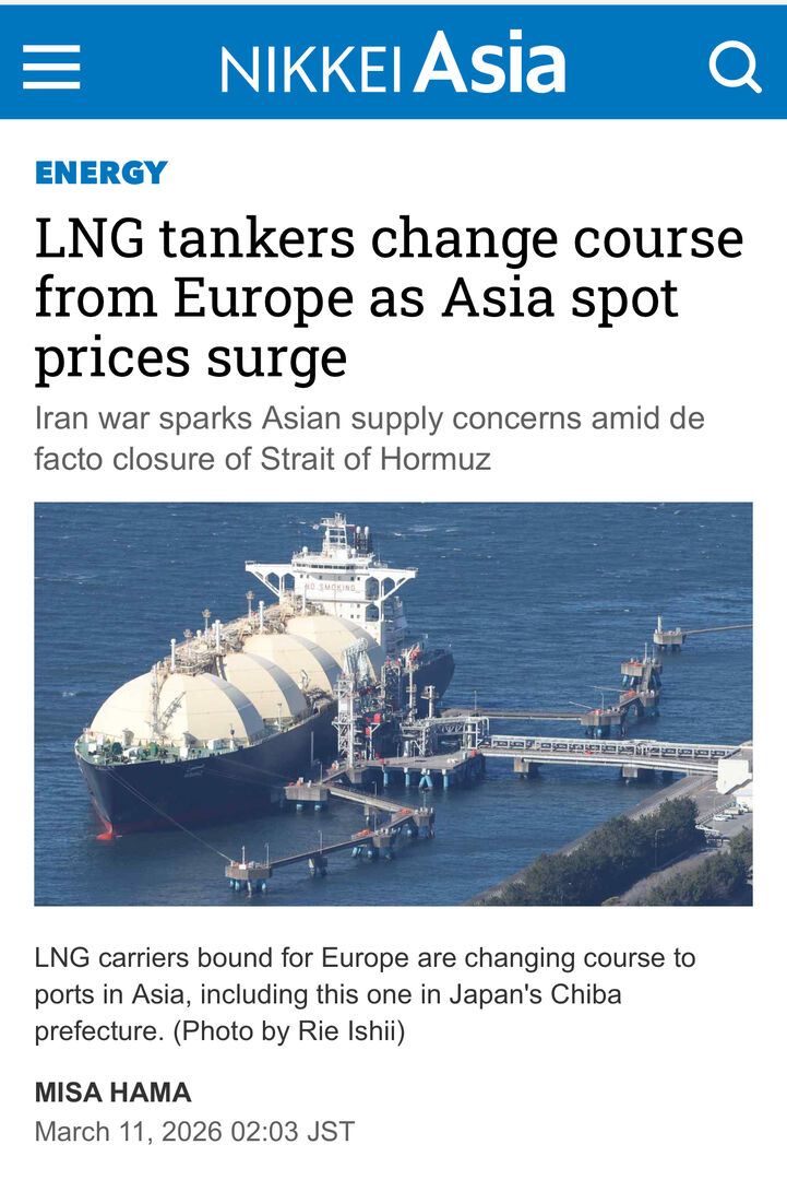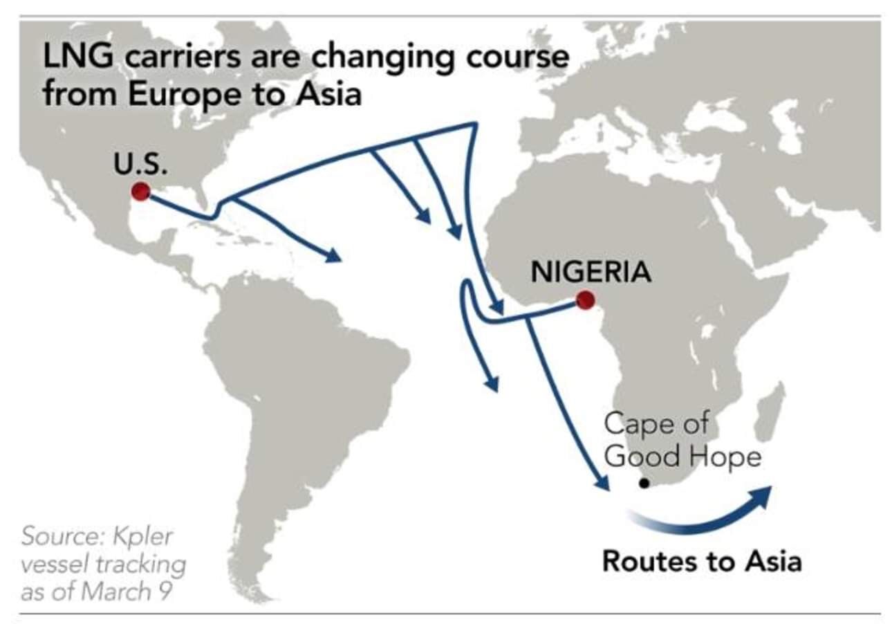Tàu chở khí hóa lỏng (LNG) đổi hướng khỏi châu Âu khi giá giao cũng như nhu cầu tại châu Á tăng vọt Chiến tranh Iran làm dấy lên lo ngại về nguồn cung ở châu Á trong bối cảnh eo biển Hormuz bị đóng cửa.