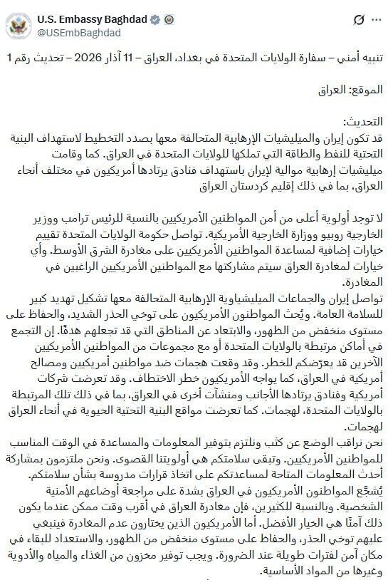 Đại sứ quán Mỹ tại Baghdad hôm 10 đưa tin Iran có thể đang lên kế hoạch tấn công vào cơ sở hạ tầng dầu khí và năng lượng thuộc sở hữu của Mỹ tại Iraq.