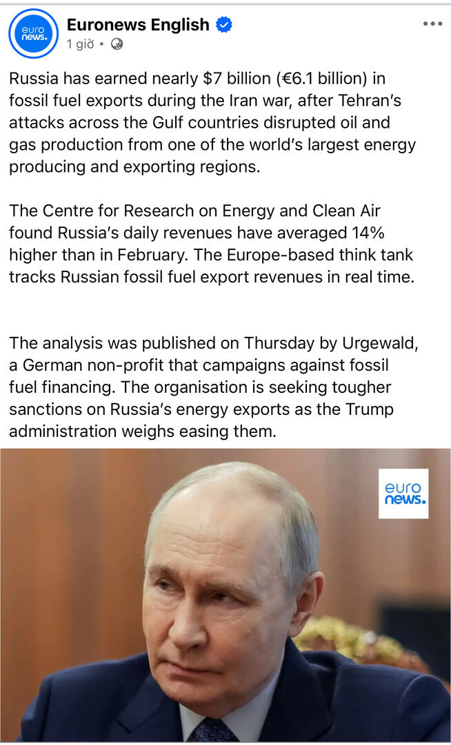 Trong suốt cuộc chiến với Iran, Nga đã thu về gần 7 tỷ đô la (6,1 tỷ euro) từ xuất khẩu nhiên liệu hóa thạch, sau khi các cuộc tấn công của Tehran vào các quốc gia vùng Vịnh làm gián đoạn sản xuất dầu khí tại một trong những khu vực sản xuất và xuất khẩu năng lượng lớn nhất thế giới.