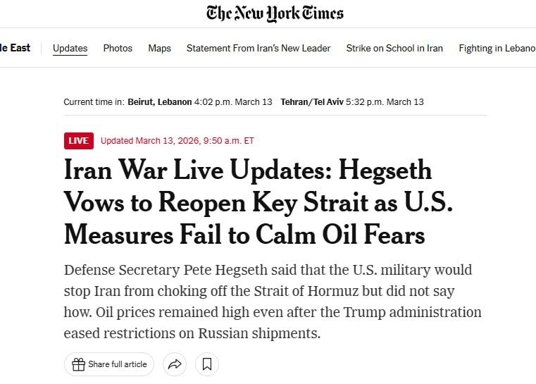 Tờ New York Times đưa tin, dẫn lời Bộ trưởng Quốc phòng Hegseth, rằng Lầu Năm Góc đã tuyên bố sẽ mở lại eo biển Hormuz.