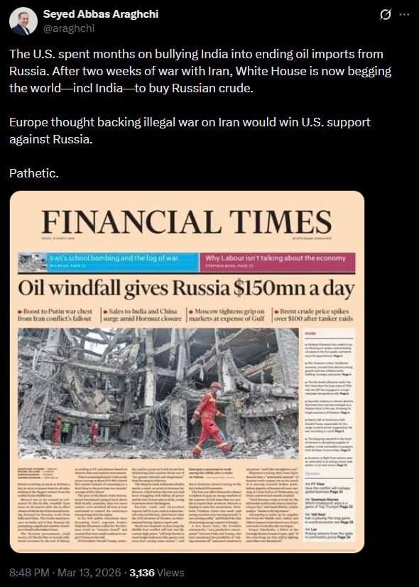 Mỹ đã dành nhiều tháng để đe dọa Ấn Độ nhằm buộc nước này ngừng nhập khẩu dầu từ Nga. Sau hai tuần chiến tranh với Iran, Nhà Trắng hiện đang cầu xin thế giới, bao gồm cả Ấn Độ, mua dầu thô của Nga.