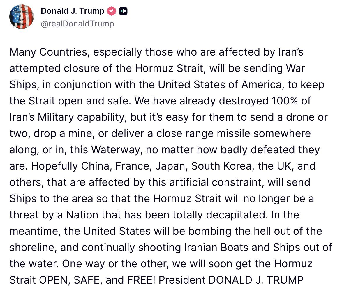 Tổng thống Mỹ nói thêm rằng Mỹ sẽ tiếp tục ném bom bờ biển Iran "để đảm bảo an toàn" khi đi qua eo biển. "Chúng ta đã phá hủy 100% năng lực quân sự của Iran, nhưng họ có thể dễ dàng điều một hoặc hai máy bay không người lái, thả thủy lôi hoặc phóng tên lửa tầm ngắn đến bất cứ đâu dọc theo hoặc trong tuyến đường thủy này, bất kể họ bị đánh bại thảm hại đến mức nào. Tôi hy vọng Trung Quốc, Pháp, Nhật Bản, Hàn Quốc, Anh và các nước khác đang chịu ảnh hưởng bởi sự hạn chế nhân tạo này sẽ điều tàu đến khu vực này để eo biển Hormuz không còn là mối đe dọa từ một quốc gia đã bị mất hoàn toàn khả năng kiểm soát", Tổng thống Mỹ nói thêm.