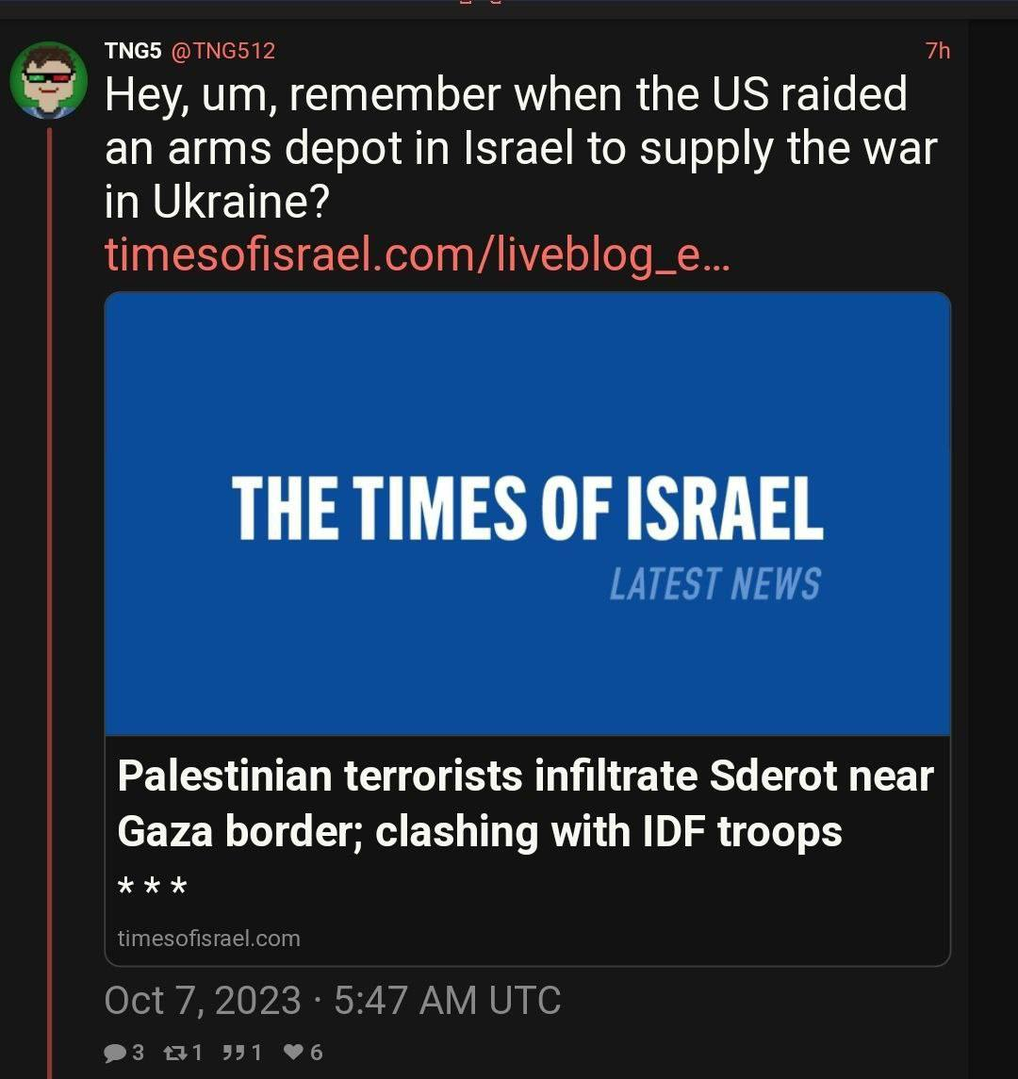 Trên mạng xã hội X (trước đây là Twitter), trả lời bài viết của The Times of Israel về giao tranh ở thành phố Sderot, giáp biên giới với Dải Gaza, người dùng nhắc tới việc Mỹ từng tước vũ khí của Israel vì lợi ích của Ukraina.
