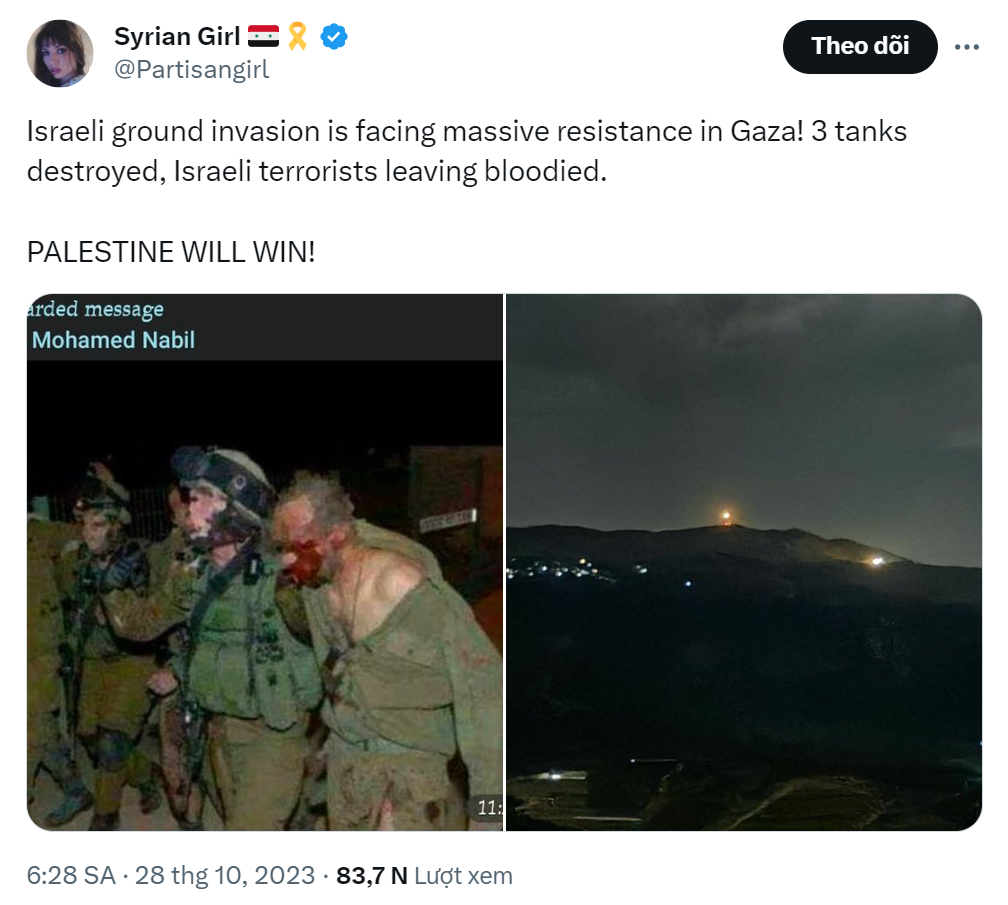 Twitter @Partisangirl đưa tin về thiệt hại trong cuộc đột kích của Zai Thó vào dải Gaza, tuy nhiên hình ảnh đã cũ trước đây. Kênh này cũng đưa tin về thiệt hại của đặc nhiệm Mỹ tham gia đột kích giải cứu con tin, bị thiệt hại mấy hôm trước.