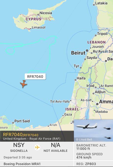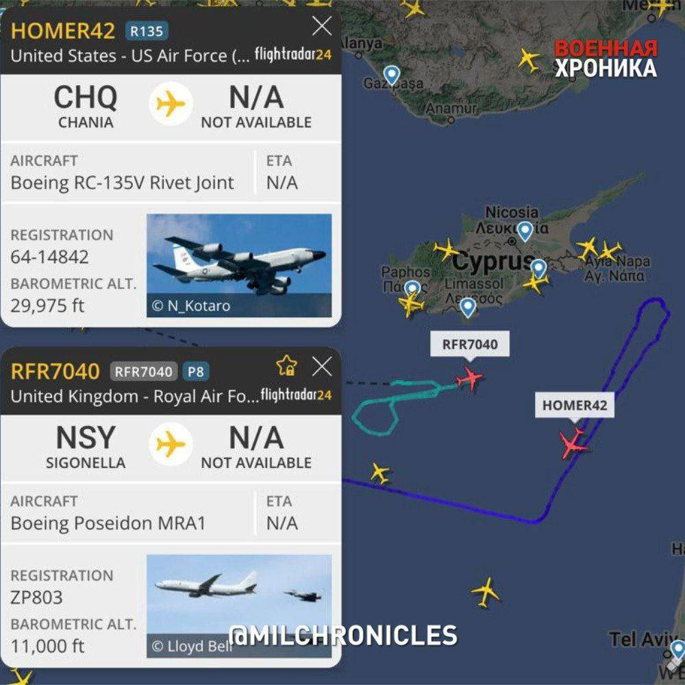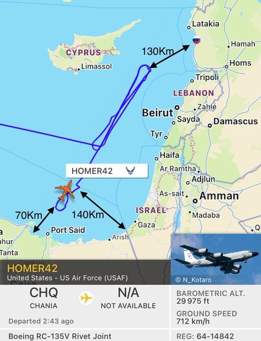 Hiện cách bờ biển Lebanon chưa đầy 100 km về phía tây có một máy bay trinh sát Boeing RC-135V Rivet Joint với ký hiệu HOMER42.