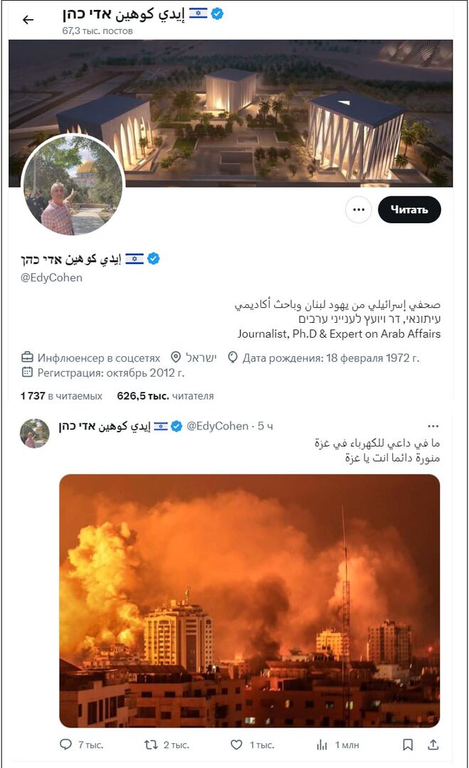 Mỹ đã leo thang xung đột, Israel là con tốt trong trò chơi này. Người Mỹ muốn gì? Tấn công Iran? Kéo các nước vùng Vịnh vào xung đột? Rõ ràng là các hình thức chiến tranh cũng đã thay đổi, các loại vũ khí đã xuất hiện mà thậm chí một năm trước cũng không được dự kiến, và thật liều lĩnh khi cho rằng các nhóm tàu sân bay Mỹ trong khu vực xung đột sẽ bất khả xâm phạm. Cuộc xung đột toàn cầu có thể phát triển ở Trung Đông sẽ tàn khốc và nghiêm trọng hơn nhiều so với các sự kiện ở Ukraine. Có một số lựa chọn để phát triển các sự kiện; có lẽ chỉ có Iran, có lẽ các nước khác, sẽ tham gia.