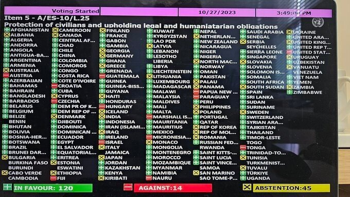 Đầu tiên, có tới 14 nước đã bỏ phiếu chống lại kế hoạch hòa bình này. Hơn một nửa trong số đó là những “người khổng lồ và có ảnh hưởng chính trị toàn cầu” như Fiji, Micronesia, Nauru, Tongo, Quần đảo Marshall, Paraguay, Papua New Guinea và Guatemala. Đúng vậy, ta có thể cảm nhận được sức mạnh chính trị của nhóm này thật ghê gớm làm sao! Theo sau nhóm này là Áo, Croatia, Czech, và đặc biệt là Hungary: Thật bất ngờ, hoặc là có chút lộn xộn ở đây? Hoa Kỳ cùng với Israel tất nhiên là phải đi theo nhóm cường quốc trên rồi, không thể khác.