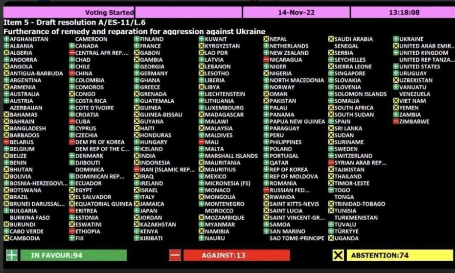 Vẫn chưa hết. Một năm trước, cũng tại Liên hợp quốc đã có một cuộc bỏ phiếu về Ukraina. Kết quả khá giống như bây giờ: Đồng ý: 94; Bỏ phiếu trắng: 74; Bỏ phiếu chống: 13. Khi đó Nga, Trung Quốc, Iran, Belarus, Cộng hòa Trung Phi… đã phản đối. Ngay lập tức Hoa Kỳ bắt đầu tuyên truyền với cả thế giới rằng Nga là “kẻ bị ruồng bỏ”, rằng hầu hết các nước đã quay lưng lại với nước Nga, rằng ngay cả những đồng minh BRICS thân cận nhất cũng bỏ phiếu trắng. Cả thế giới phương Tây đã dường như phát cuồng!!!(Ảnh 2 - Đồng ý: 94; Bỏ phiếu trắng: 74; Bỏ phiếu chống: 13).