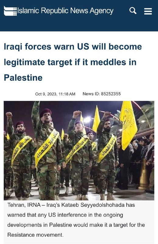 🇮🇶🇵🇸 Nhóm Kataeb Seyyedolshohada của Iraq đã cảnh báo rằng bất kỳ sự can thiệp nào của Hoa Kỳ vào những diễn biến đang diễn ra ở Palestine sẽ khiến nơi đây trở thành mục tiêu của phong trào Kháng chiến.
