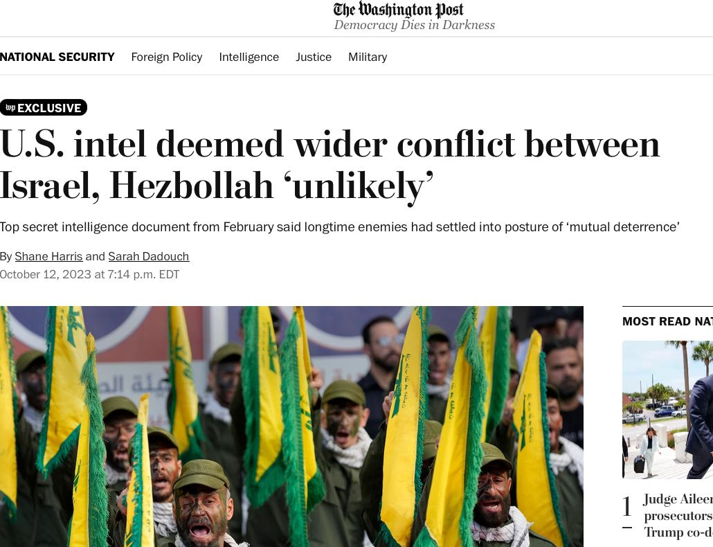 Tờ báo đề cập đến một “tài liệu tình báo bí mật của Mỹ”. Trong đó nói rằng các nhà phân tích Mỹ vào tháng 2 năm 2023 đã cho rằng giữa Hezbollah và Israel đã thiết lập một “sự cân bằng có thể dự đoán được, tuy có hung hăng nhưng là sự cân bằng”, điều này làm giảm khả năng xảy ra đối đầu quân sự toàn diện giữa hai bên.