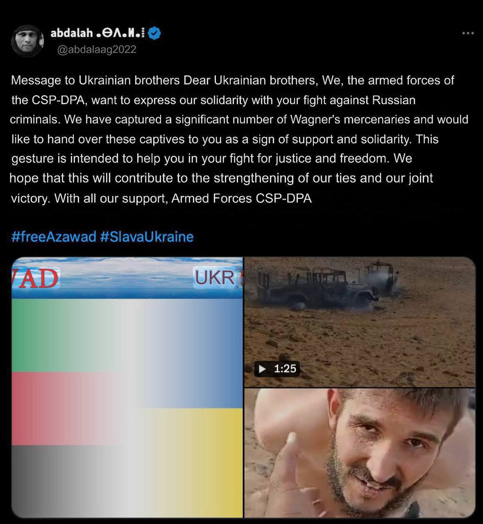 Phe ly khai Malian đã viết trên mạng xã hội, tuyên bố rằng họ sẵn sàng giao nộp các chiến binh Wagner bị bắt cho Ukraine như một “dấu hiệu của sự ủng hộ và đoàn kết”.