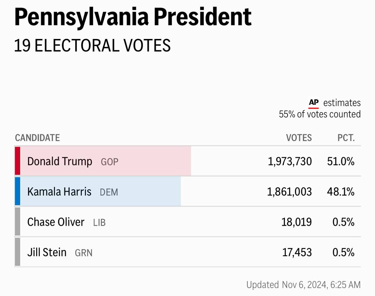 51% so với 48,1% - Trump đang dẫn đầu ở Pennsylvania, điều quan trọng để giành chiến thắng trong cuộc bầu cử: “Sau khi các giao thức đầu tiên được tính, Tổng thống thứ 45 của Hoa Kỳ đã đứng sau Kamala Harris, người đang giành được hơn 70% phiếu bầu bỏ phiếu. Bây giờ ủy ban đã đếm được 50% số phiếu bầu, Trump đang dẫn trước đối thủ của mình 20 nghìn phiếu bầu ”.