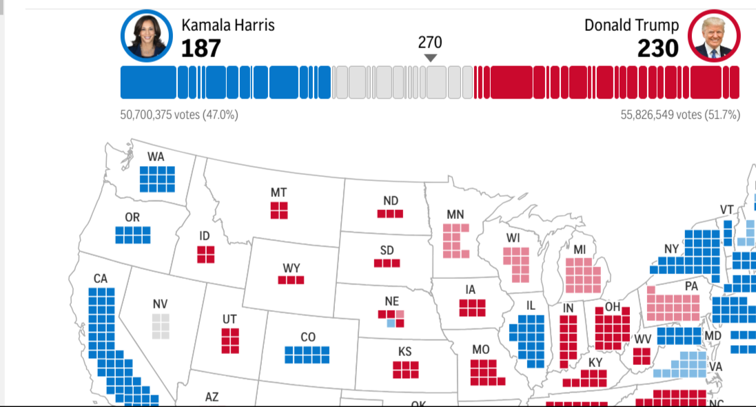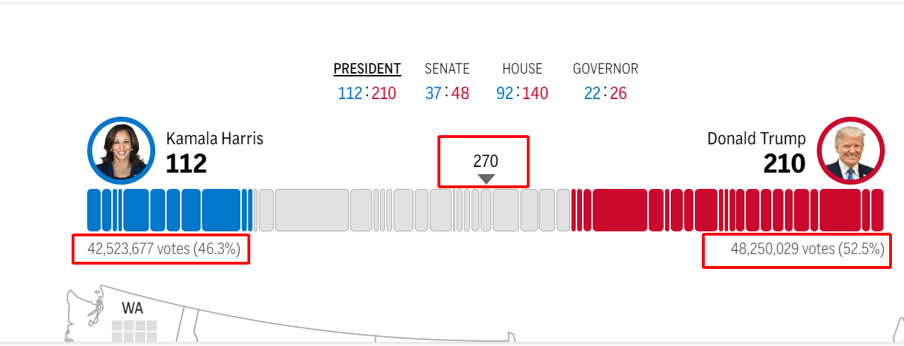 Phó Tổng thống Kamala Harris đã giành được 12 phiếu đại cử tri của Washington vào thứ Ba, đánh bại cựu Tổng thống Donald Trump ở một tiểu bang mà ông không được ưa chuộng. Washington chưa từng bầu cho ứng cử viên tổng thống đảng Cộng hòa nào kể từ Ronald Reagan năm 1984. Tổng thống Joe Biden đã giành chiến thắng ở Washington năm 2020 với 58% số phiếu so với chưa đến 39% của Trump. Associated Press tuyên bố Harris là người chiến thắng lúc 11:00 tối EST.