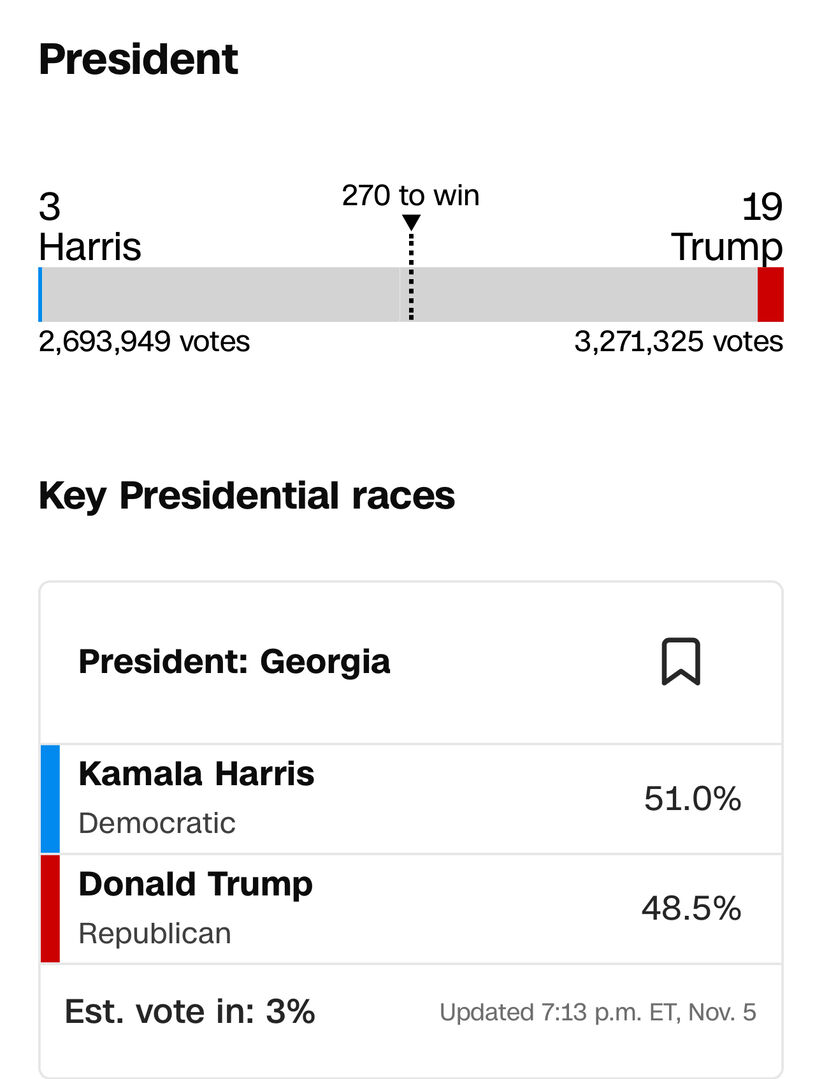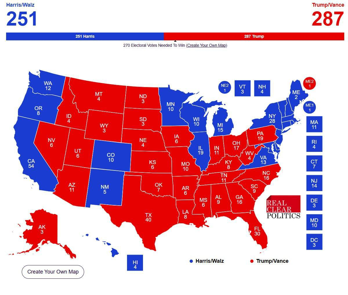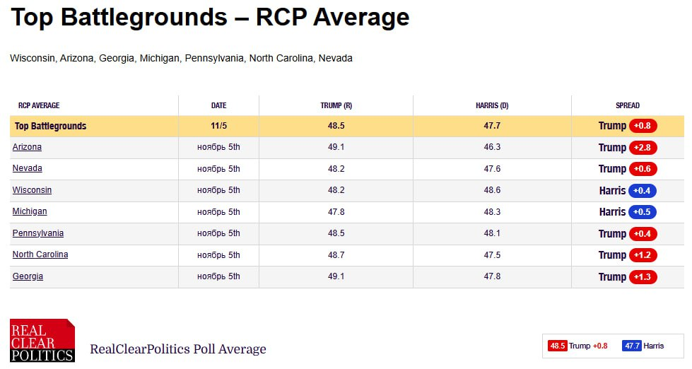 Donald Trump dẫn trước Kamala Harris ở hầu hết các bang xung đột, trang tổng hợp cuộc thăm dò RealClearPolitics. ▪️Theo giá trị chỉ số, khoảng cách là 0,8 điểm phần trăm.
