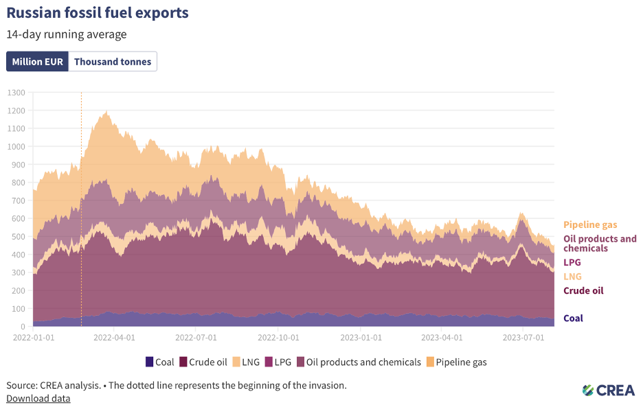 Theo dữ liệu của Centre for Research on Energy and Clean Air (CREA), doanh thu dầu khí của Nga đạt đỉnh vào tháng 3/2022 với doanh thu trung bình khoảng 1,2 tỷ EUR/ngày. Khi các lệnh cấm vận khí đốt bắt đầu có hiệu lực, cộng với việc các nước châu Âu đã trải qua 1 mùa đông không quá lạnh giá, thì sản lượng doanh thu từ dầu mỏ và khí đốt của Nga chứng kiến sự sụt giảm mạnh về mức khoảng 700 triệu EUR/ngày vào cuối năm 2022. Sự sụt giảm doanh thu chủ yếu đến từ việc sụt giảm sản lượng khí đốt cung cấp sang Châu Âu qua đường ống dẫn khí, so với thị phần 40% thị trường khí đốt của Châu Âu trước chiến tranh, sau mùa đông 2022-2023, Nga chỉ còn chiếm khoảng 5-10% thị phần khí đốt của Châu Âu. Đến tháng 1/2023, khi các lệnh cấm vận dầu mỏ của Châu Âu và quy định giá trần 60USD/thùng có hiệu lực, doanh thu dầu mỏ và khí đốt của Nga tiếp tục chứng kiến sự sụt giảm mạnh và bền vững về mức khoảng 500 triệu EU/ngày, mức sụt giảm khoảng 140% so với mức đỉnh vào tháng 4/2022.