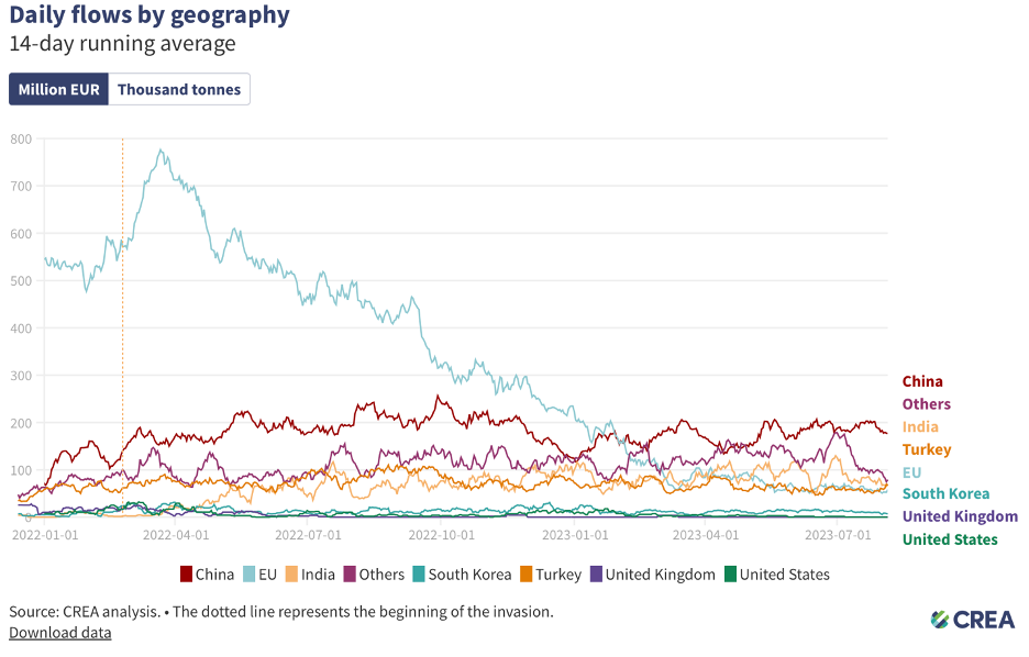 Trước các lệnh cấm vận dầu khí của Phương tây, Trung quốc và Ấn Độ nổi lên như những đối tác mua nhiều dầu và khí đốt từ Nga, tuy nhiên trên thực tế thì doanh thu tăng lên 2 đối tác này không thể bù đắp lại sự sụt giảm từ việc mất đối tác lớn Phương tây. Cụ thể, Trung quốc đã mua dầu và khí đốt của Nga từ mức 60 triệu EUR/ngày - trước 2022, lên mức 170-200 triệu EUR/ngày. Còn Ấn Độ, trước chiến tranh mua rất ít dầu Nga, đã tăng mua lên mức 70-120 triệu EUR/ngày. Còn Châu Âu đã giảm từ mức tiêu thụ 600-800 triệu EUR/ngày về mức dưới 100 triệu EUR/ngày.