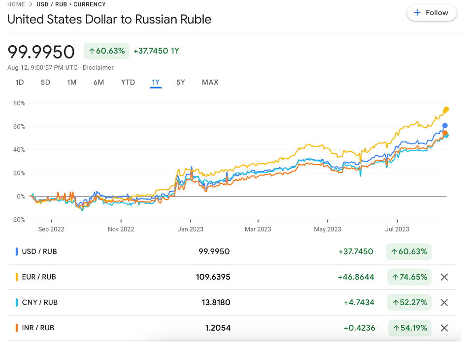Hình 3 và 4 thể hiện việc mất giá của đồng Ruble so với USD trong 1 năm, và so sánh sự mất giá với các đồng tiền của các đối tác quan trọng là Trung quốc và Ấn Độ. So với 1 năm trước, đồng Ruble đã mất giá tới 60% so với USD, mất giá 75% so với EUR, mất giá 52% so với đồng Nhân dân tệ của Trung quốc, và mất giá 54% so với đồng Rupee của Ấn độ. Lí giải về việc mất giá của RUB so với USD và EUR, mặc dù Mỹ và EU đã gần như ngừng toàn bộ các giao dịch thương mại với Nga, tuy nhiên USD và EUR vẫn được sử dụng trong các giao dịch mua bán với các nước khác, vì vậy các cặp tỷ giá này vẫn có ý nghĩa trong việc thực hiện các giao dịch xuất nhập khẩu của Nga với các đối tác còn lại. Ấn Độ là nước tích cực tăng mua dầu từ Nga, tuy nhiên việc đồng Ruble mất giá tới 54% so với đồng Rupee của Ấn độ phản ánh cán cân xuất nhập khẩu tiêu cực cho phía Nga khi Ấn độ có thể sử dụng đồng nội tệ Rupee để mua dầu Nga giá rẻ hơn. Với trường hợp của Trung quốc, đây là nước đóng vai trò đối tác lớn và hậu thuẫn mạnh cho nền kinh tế Nga bằng việc mua dầu và khí đốt, và cung cấp lại cho Nga các hàng hoá và công nghệ thay thế cho Phương tây, việc tỷ giá đồng Ruble bị sụt giảm 52% so với Nhân dân tệ phản ánh cán cân xuất nhập khẩu tiêu cực và việc Nga phải lệ thuộc vào việc sử dụng đồng Nhân dân tệ trong giao dịch xuất nhập khẩu.