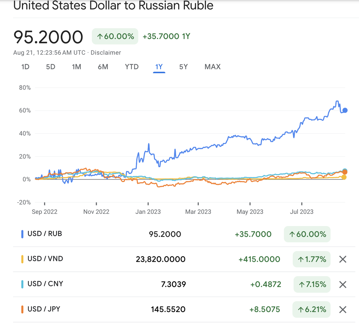 Kể từ khi cuộc chiến Nga-Ukraine do Tổng thống Putin phát động vào tháng 2/2022, nền kinh tế Nga đã bị các nước Phương Tây tiến hành cấm vận với rất nhiều các lệnh cấm vận nhằm vào nền kinh tế Nga. Ngay sau khi phát động cuộc chiến, tỷ gía RUB/USD giảm mạnh trong thời gian rất ngắn, từ 70RUB/USD về 134RUB/USD (tương đương với mất gía 90%),phản ánh tâm lý lo sợ trước viễn cảnh nền kinh tế Nga bị cô lập và việc nguồn vốn đầu tư rút chạy khỏi Nga.Chính phủ Nga và NHTW Nga đã có một số động thái rất quyết liệt nhằm bảo vệ giá trị đồng nội tệ Nga, trong đó có việc tăng lãi suất lên 20%/năm, giới hạn giao dịch chuyển tiền ra nước ngoài… và đã thành công trong việc đưa tỷ giá nội tệ quay về mức thấp nhất là 50-60RUB/USD vào tháng 8/2022.