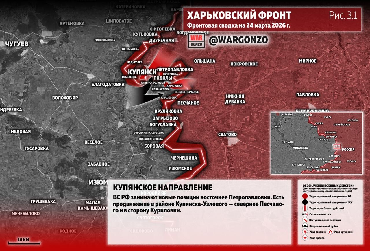Trên mặt trận Kupyansk, Lực lượng vũ trang Nga đang chiếm giữ các vị trí mới ở phía đông Petrovpavlovka. Có sự tiến công gần Kupyansk-Uzlovaya, phía bắc Peschanoye và hướng về Kurilovka. (Hình 3.1)