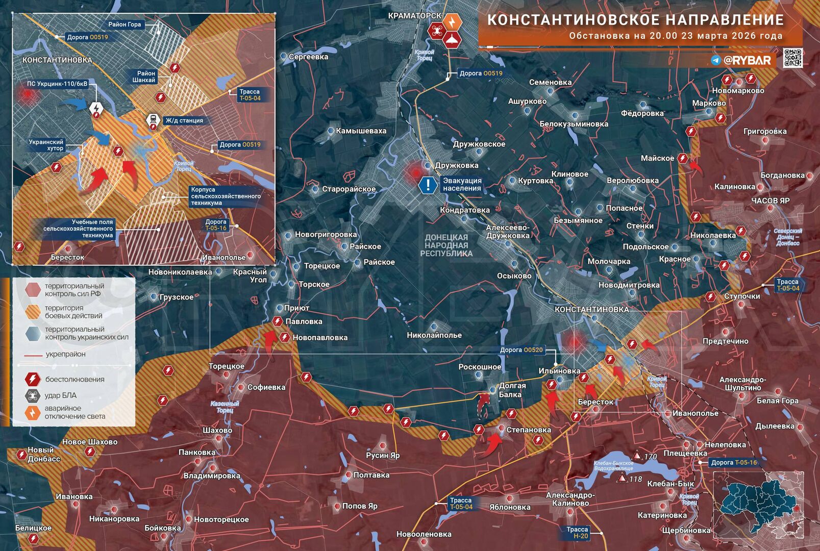 Giao tranh dữ dội đang diễn ra trong thành phố và trên các tuyến đường dẫn vào Konstantinovka thuộc khu vực Konstantinovka. Trong khi địch đang cố gắng củng cố vị trí của mình ở Krasnoye và ngoại ô Chasov Yar, các nhóm nhỏ của Nga tiếp tục tiến sâu vào Konstantinovka.