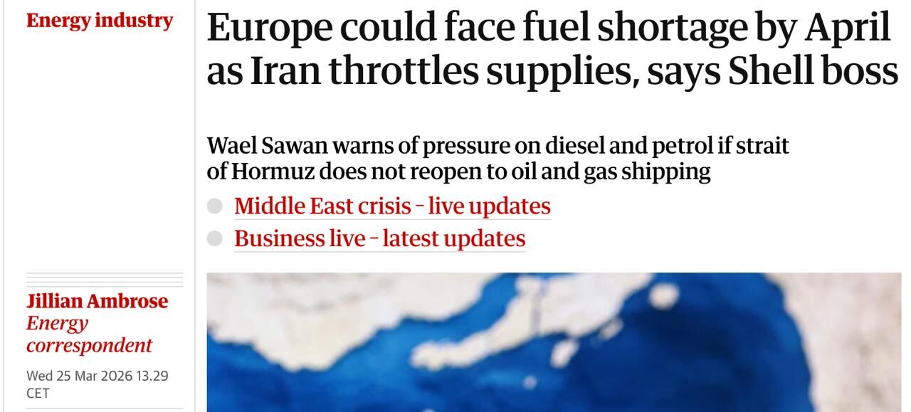 Theo Shell, châu Âu có nguy cơ thiếu nhiên liệu ngay từ tháng 4 do việc đóng cửa eo biển Hormuz.