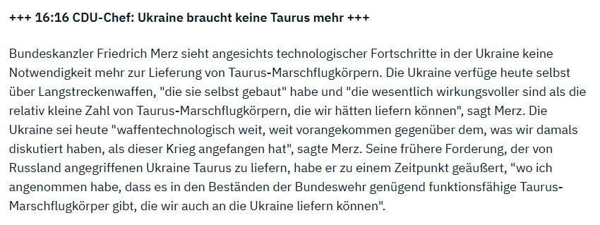 Tại Quốc hội Đức, Merz tuyên bố rằng ông không thấy cần thiết phải cung cấp tên lửa hành trình Taurus nữa do sự tiến bộ công nghệ của Ukraine.