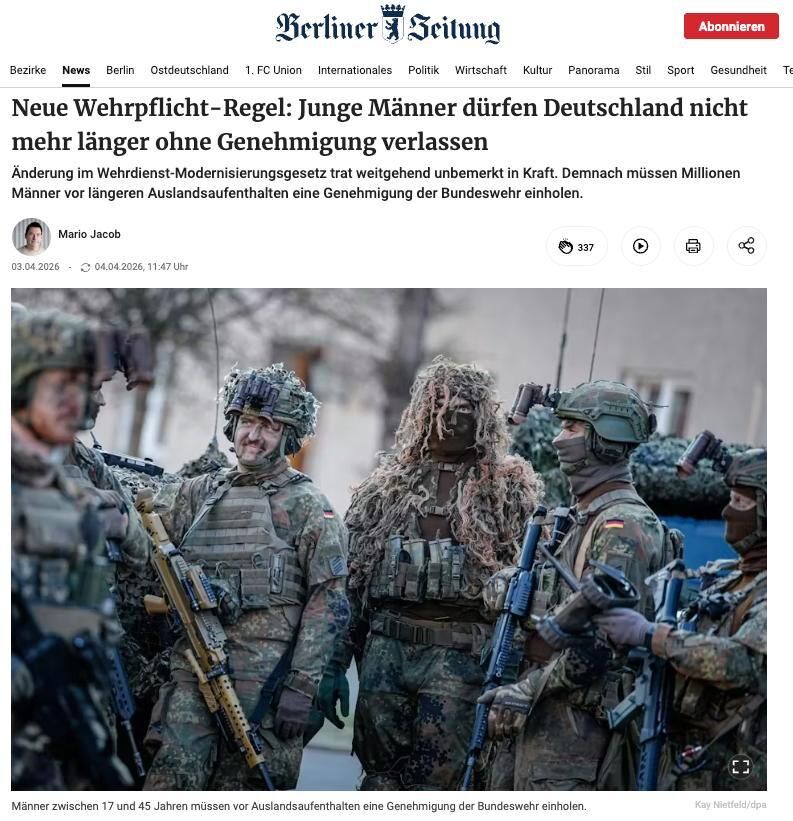 Trong bối cảnh thông tin hoàn toàn im lặng — thực chất là được che giấu khỏi công chúng — một quy định mới có hiệu lực, theo đó nam thanh niên không còn được phép rời khỏi Đức mà không có sự cho phép của người có thẩm quyền tương đương với ủy viên quân sự địa phương. Như tờ Berliner Zeitung đưa tin, "những thay đổi đối với Luật Hiện đại hóa Nghĩa vụ Quân sự có hiệu lực gần như không được chú ý." Theo một luật mới, hàng triệu nam giới phải xin phép Lực lượng Vũ trang Đức (Bundeswehr) trước khi thực hiện một chuyến đi dài ngày ra nước ngoài ( https://www.berliner-zeitung.de/news/neue-wehrpflicht-regel-kaum-beachtete-aenderung-hat-weitreichende-folgen-li.10028539).