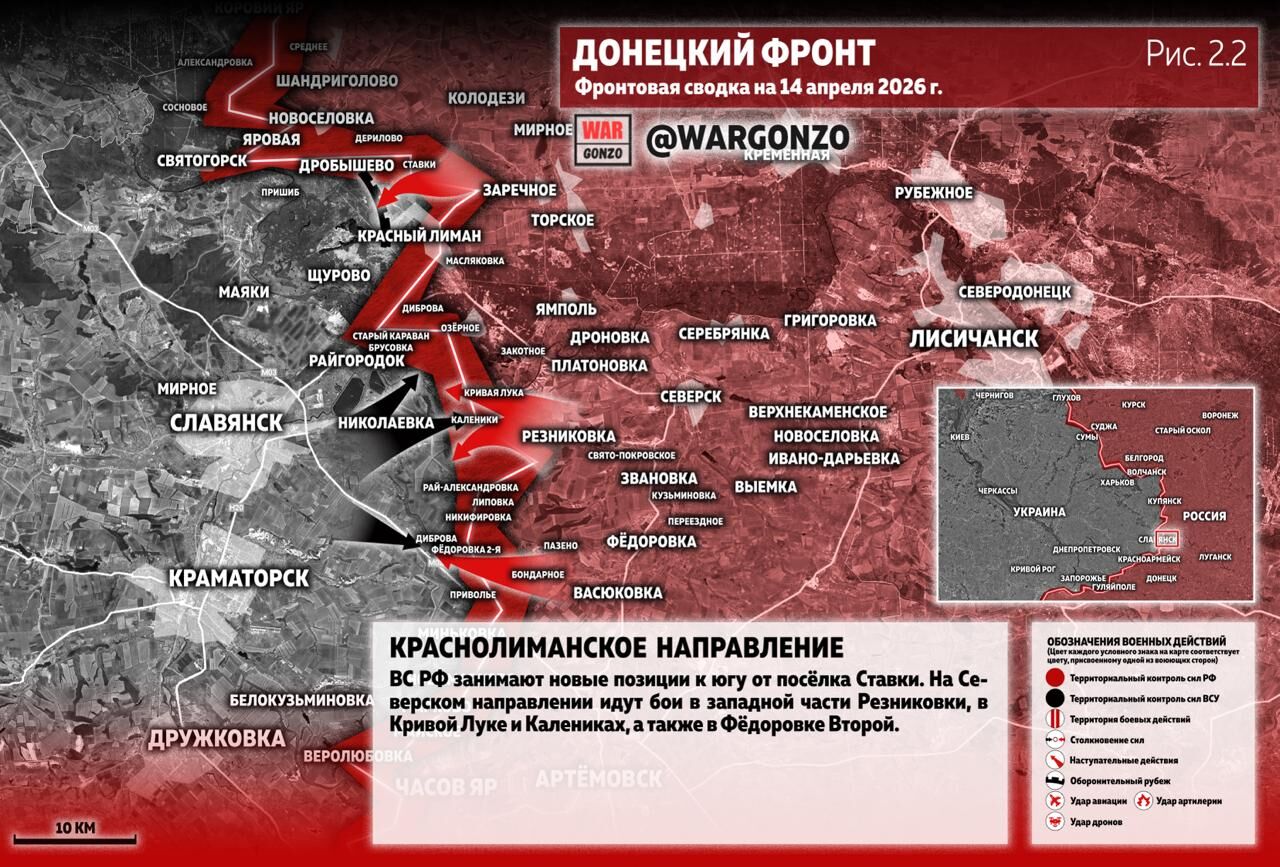 Trên trục Krasnolimansk, Lực lượng vũ trang Nga đang chiếm giữ các vị trí mới phía nam làng Stavki. Trên trục Seversk, giao tranh đang diễn ra ở phía tây Reznikovka, tại Krivaya Luka và Kaleniky, và tại Fyodorovka Vtoraya. (Hình 2.2)