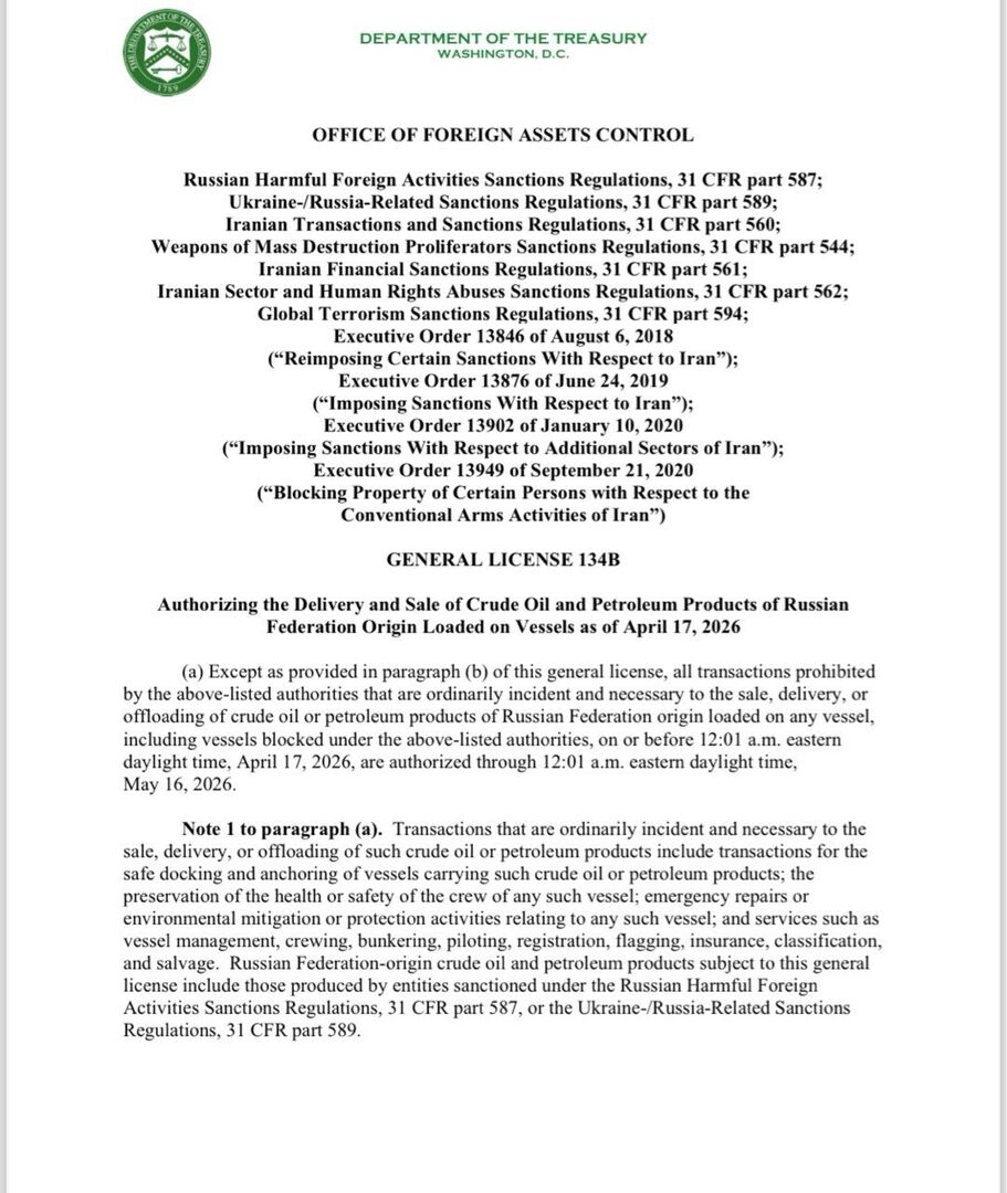 "Mỹ đã dỡ bỏ lệnh trừng phạt đối với dầu mỏ của Nga được vận chuyển trên các tàu chở dầu cho đến ngày 17 tháng 4. Văn bản này có hiệu lực đến ngày 16 tháng 5."