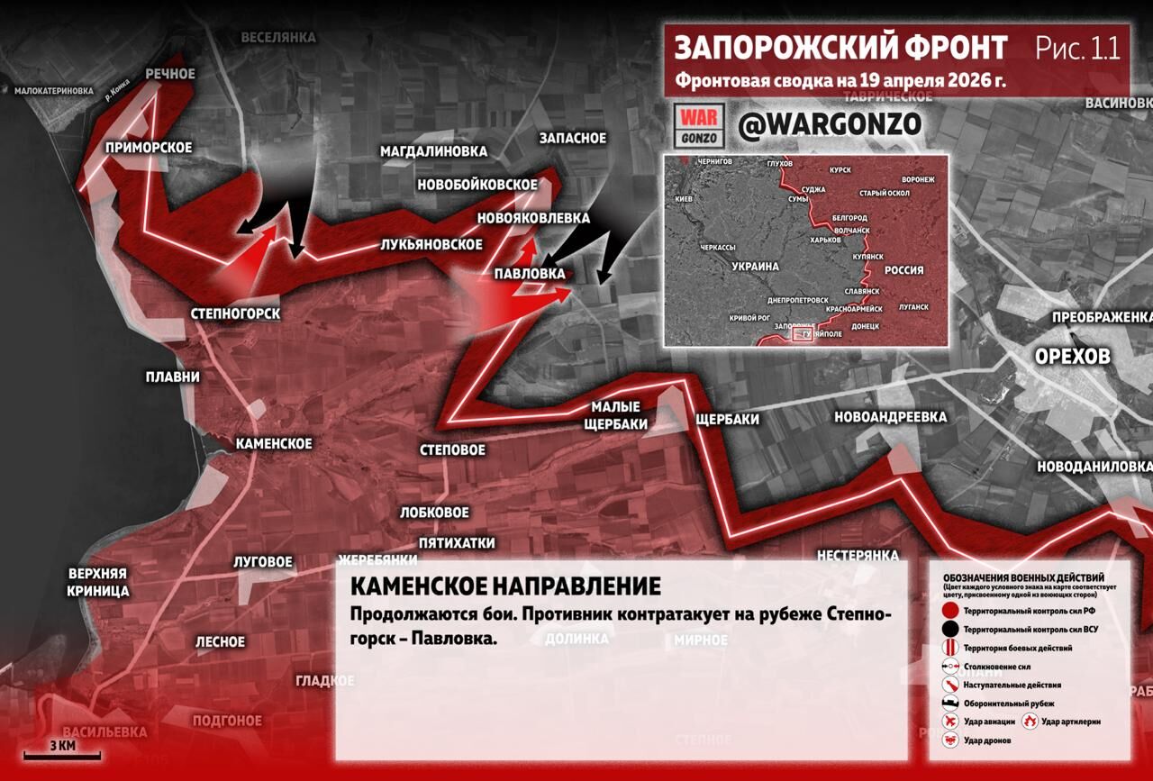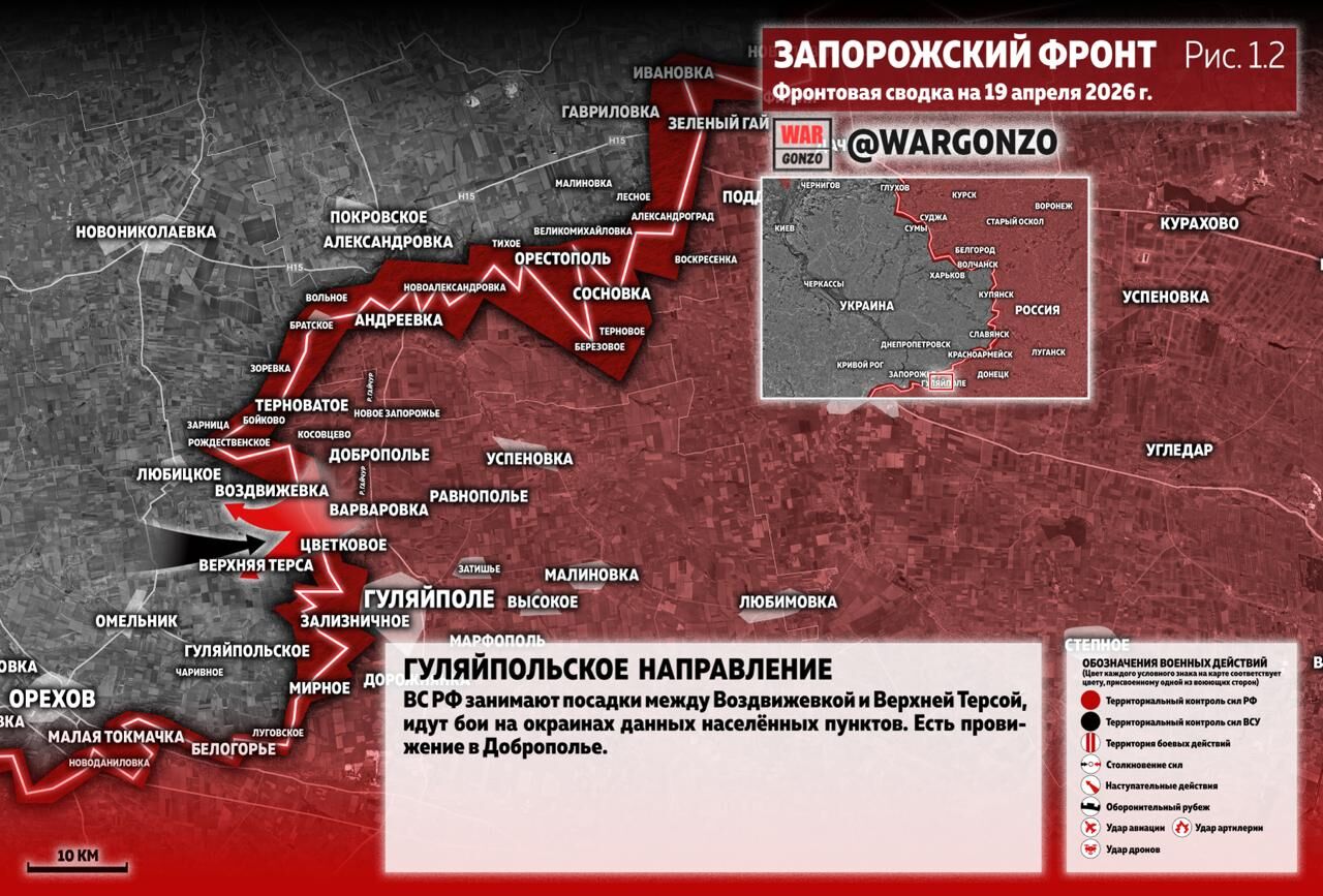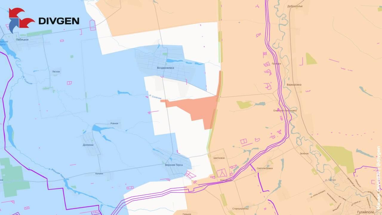Tại khu vực Gulyai-Polye, Lực lượng vũ trang Nga đang chiếm giữ các bãi đổ bộ giữa Vozdvizhevka và Verkhnyaya Tersa, giao tranh vẫn tiếp diễn ở ngoại ô các thị trấn này. Có một số hoạt động di chuyển ở Dobropillya. (Hình 1.2)