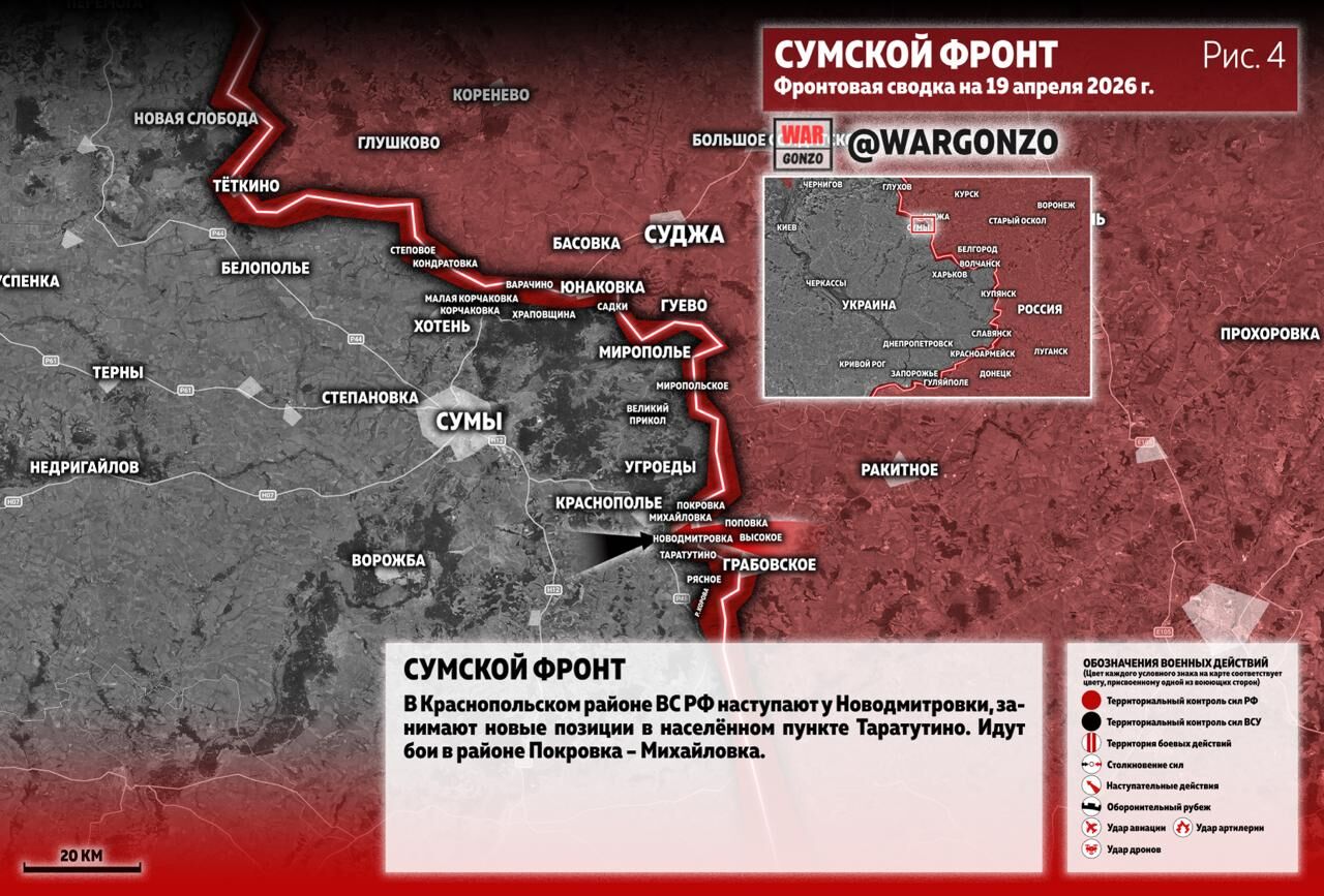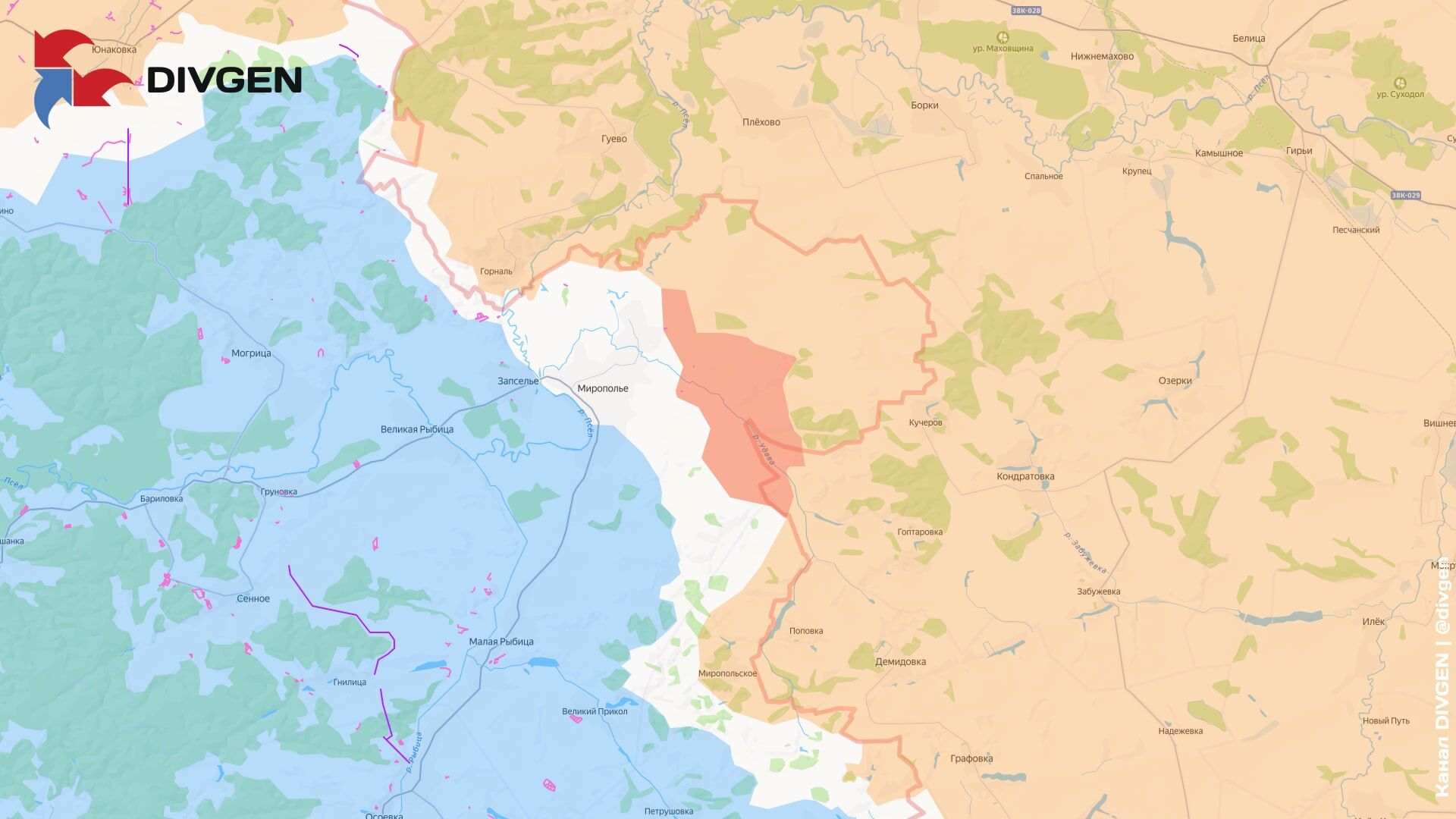 Tại quận Krasnopolsky, Lực lượng vũ trang Nga đang tiến gần Novodmitrovka, chiếm giữ các vị trí mới tại làng Taratutino. Giao tranh vẫn đang diễn ra ở khu vực Pokrovka-Mikhailovka. (Hình 4)