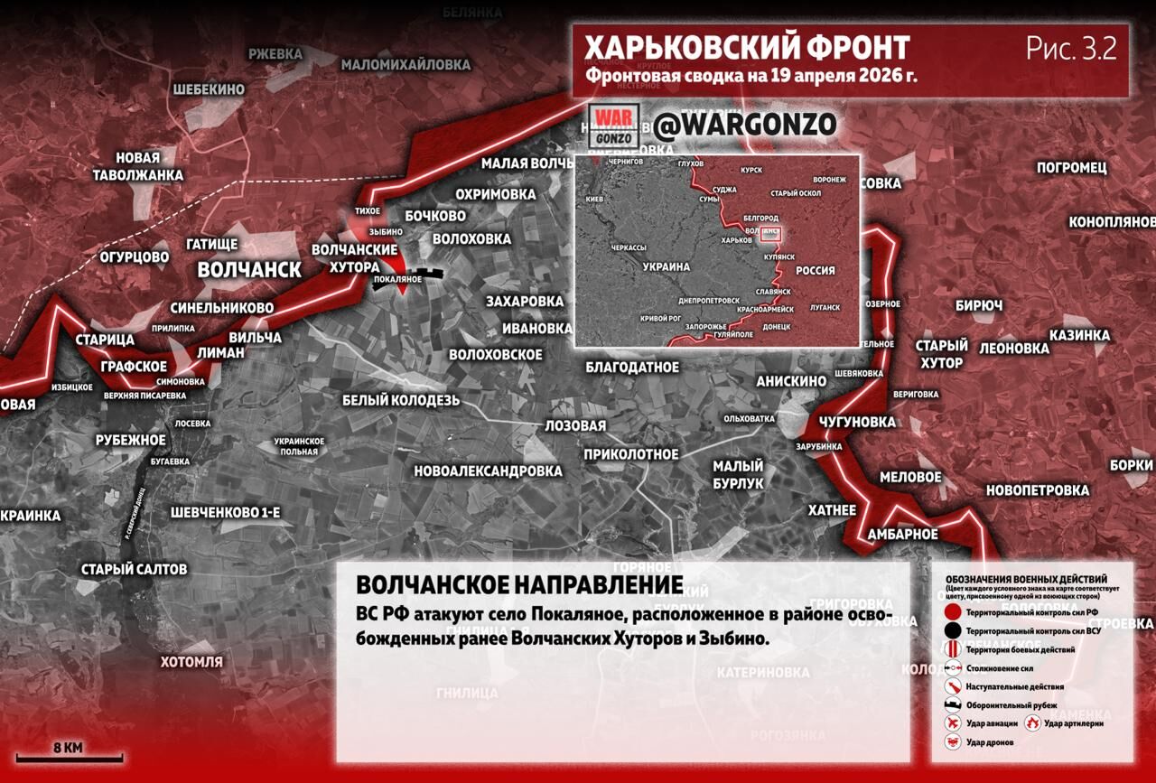 Trên mặt trận Volchansk, Lực lượng vũ trang Nga đang tấn công làng Pokalyanoye, nằm gần các làng Volchanskiye Khutors và Zybino đã được giải phóng trước đó. (Hình 3.2)