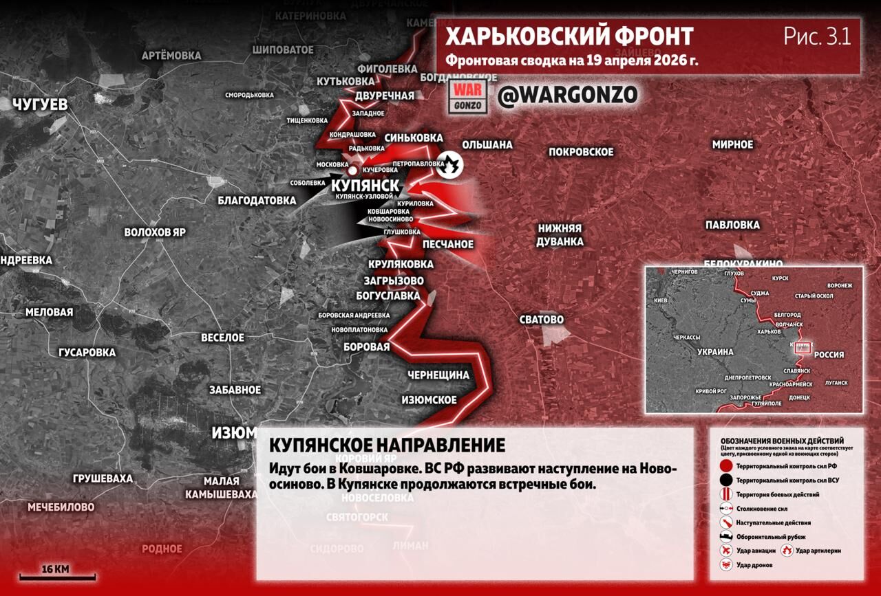 Trên mặt trận Kupyansk, giao tranh đang diễn ra gần Kovsharovka. Lực lượng vũ trang Nga đang tiến về Novoosinovo. Các cuộc phản công vẫn tiếp diễn ở Kupyansk. (Hình 3.1)