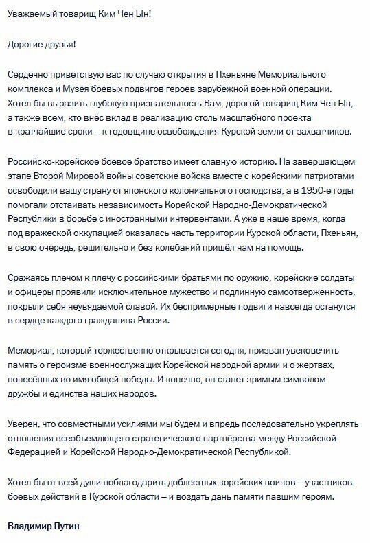 Tổng thống đã gửi lời chúc mừng tới Kim Jong-un và những người tham dự lễ khai trương đài tưởng niệm và bảo tàng các anh hùng của chiến dịch quân sự ở nước ngoài tại Bình Nhưỡng.