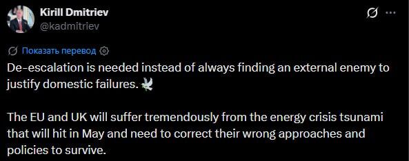 "Liên minh châu Âu và Anh sẽ bị ảnh hưởng nặng nề bởi cơn sóng thần khủng hoảng năng lượng sẽ ập đến vào tháng Năm, và họ sẽ phải điều chỉnh những phương pháp và chính sách sai lầm của mình để tồn tại," đặc phái viên của Putin viết.