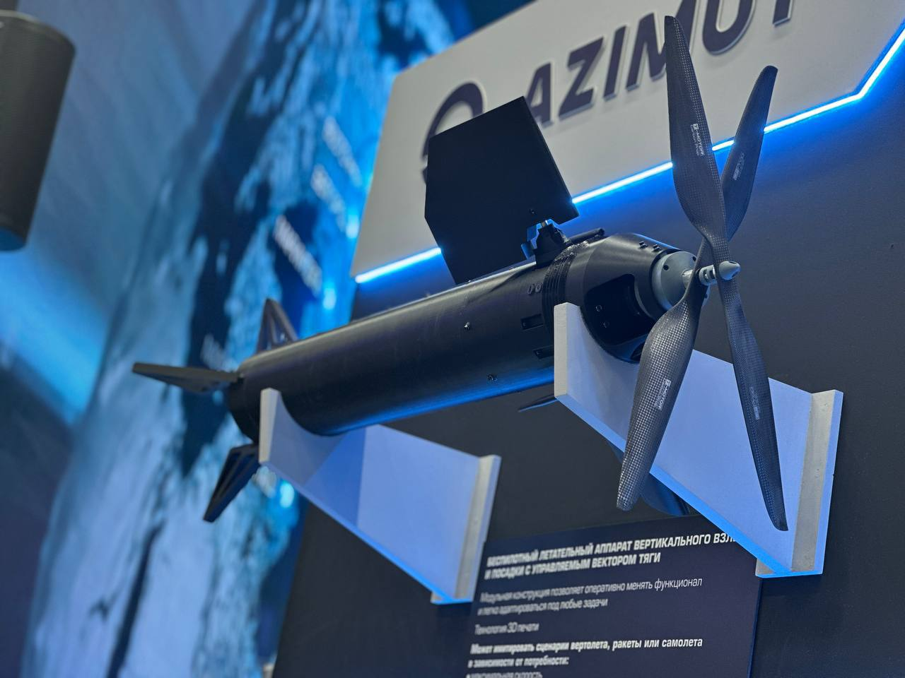 Azimut, một công ty thuộc Rostec, đang tiến hành thử nghiệm thực địa một loại máy bay không người lái đa năng mới do chính công ty thiết kế. Thân máy bay được in 3D hoàn toàn và bao gồm một "ống" với đầu robot.