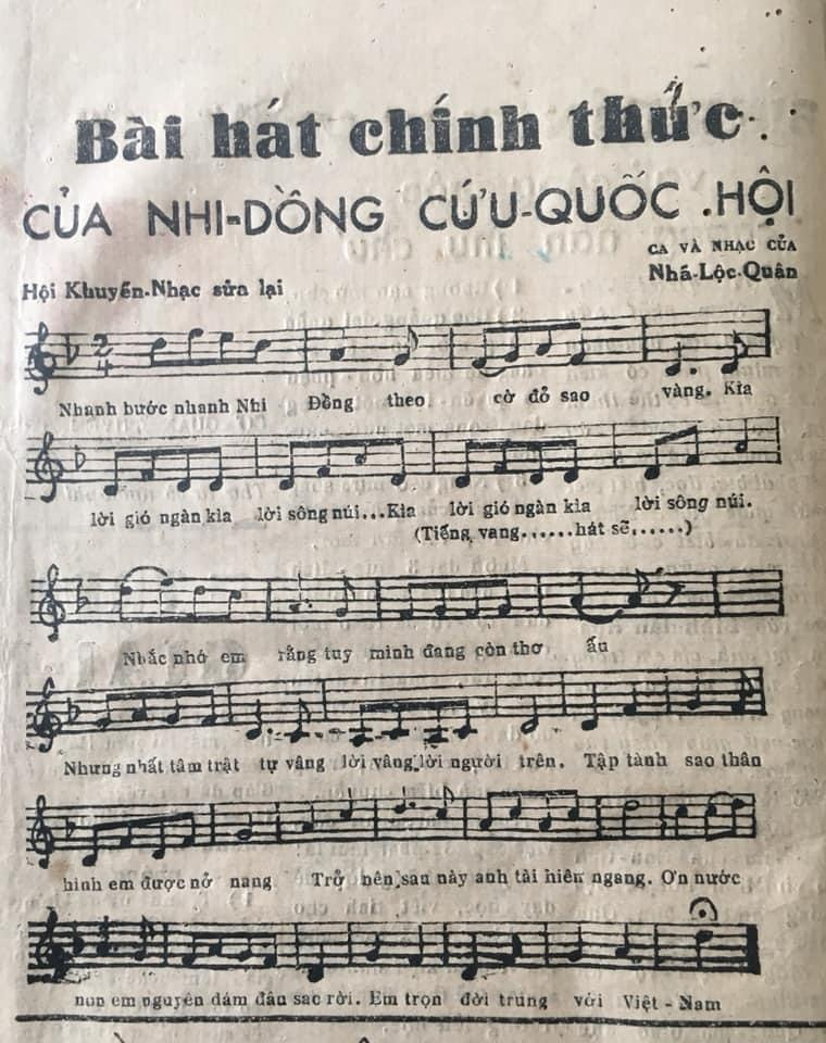 Nhanh bước nhanh nhi đồng, Theo cờ đỏ sao vàng, Kìa lời gió ngàn, kìa lời sông núi, Kìa lời gió ngàn, kìa lời sông núi, Nhắc nhở em rằng, Tuy mình đang còn thơ ấu, Nhưng chúng em kết đoàn, Chăm làm chăm học cho ngoan.