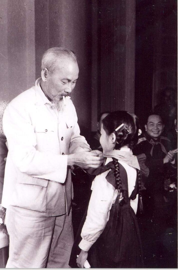 Bác Hồ quàng khăn đỏ (của thiếu nhi quốc tế tặng thiếu nhi Việt Nam) cho một đại biểu thiếu nhi Thủ đô tại Nhà khách Phủ Chủ tịch khi các cháu đến chúc Tết Người nhân dịp Xuân Canh Tý, ngày 28/1/1960 (Cháu gái đã vinh dự được Bác Hồ quàng khăn đỏ tên là Nguyễn Thị Đỉnh, học sinh lớp 6 trường cấp II Trưng Vương, Hà Nội)