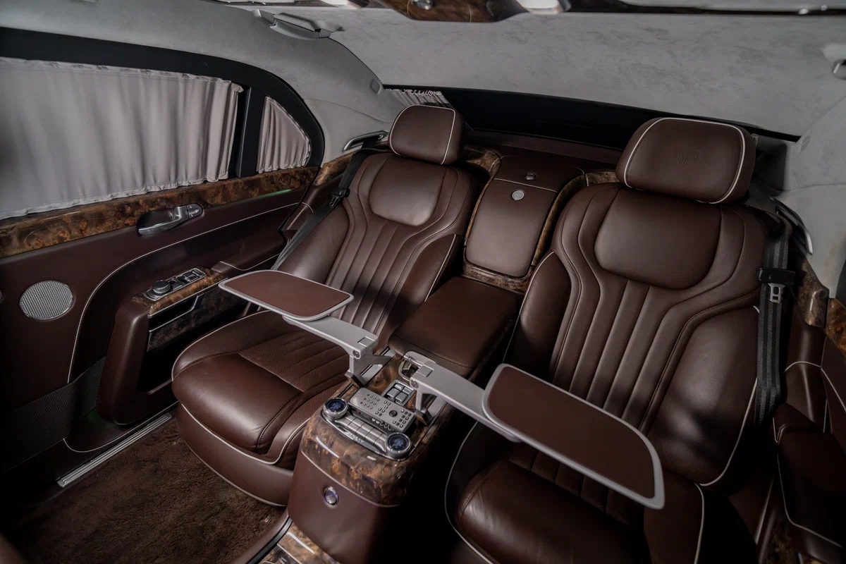 Bên trong có vách ngăn giữa tài xế và hành khách, cũng như tủ lạnh và minibar.
