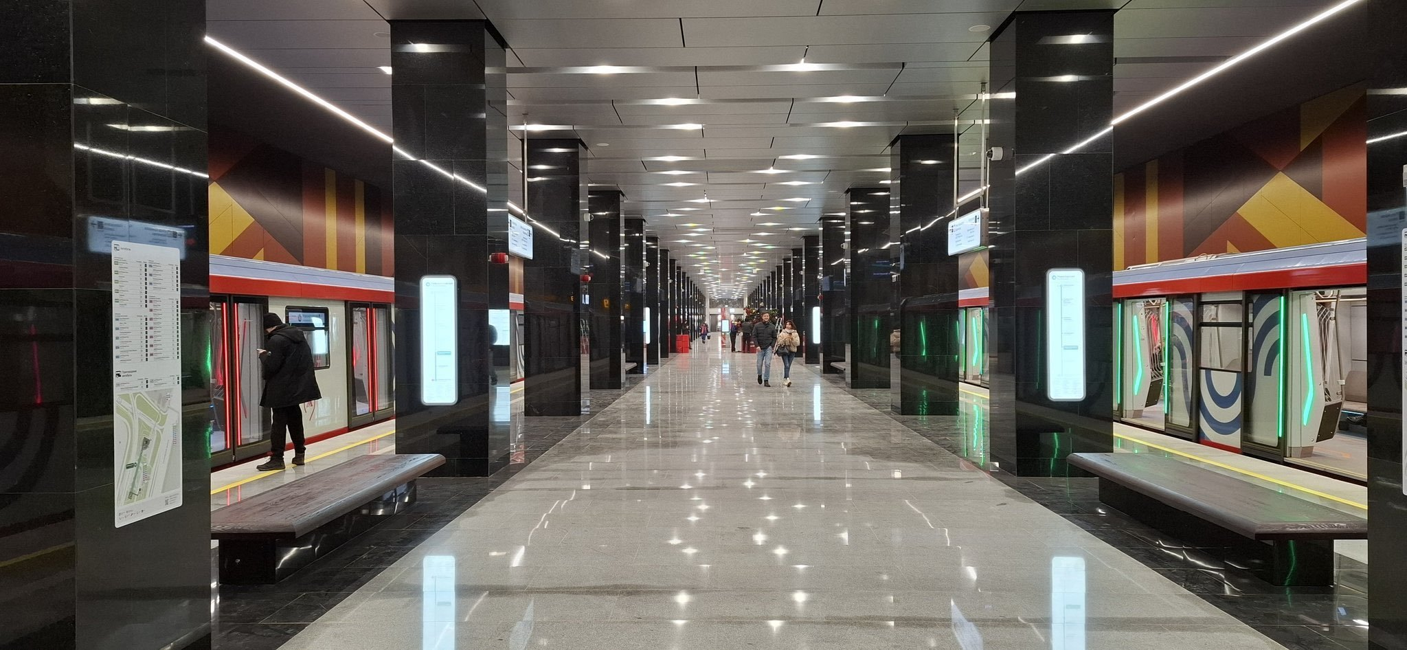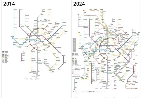 Mạng lưới Metro Moscow, Nga sau 10 năm (2014 - 2024) Hiện tại, tàu điện ngầm và tuyến Vòng tròn Trung tâm Moscow (MCK) có tổng cộng 299 ga và 16 tuyến. Trên một số tuyến đã bắt đầu vận hành các đoàn tàu hiện đại nhất mang tên "Moscow-2024". Tàu được lắp ráp tới 95% từ các linh kiện sản xuất trong nước. Tàu điện ngầm Moscow chạy suốt ngày đêm với khoảng cách giữa các chuyến tàu gần như chỉ một phút. Hiện tại, riêng hệ thống tàu điện ngầm thực hiện hơn 8 triệu chuyến đi mỗi ngày. Trong năm nay, các tuyến đường sắt đô thị thực hiện hơn 400 triệu chuyến đi, tàu điện là 190 triệu chuyến. Đặc biệt, kỷ niệm 125 năm tàu điện Moscow được đưa vào sử dụng, thành phố bắt đầu triển khai tàu điện không người lái đầu tiên ở Nga. Trong suốt quá trình thử nghiệm, phương tiện giao thông thông minh này đã chạy hơn 2.800 km. Ảnh 3 ga ngầm Kornilovskaya, Kommunarka, Novomoskovskaya của Moscow Metro vừa được khai trương hôm 28/12/2024 Theo VOV