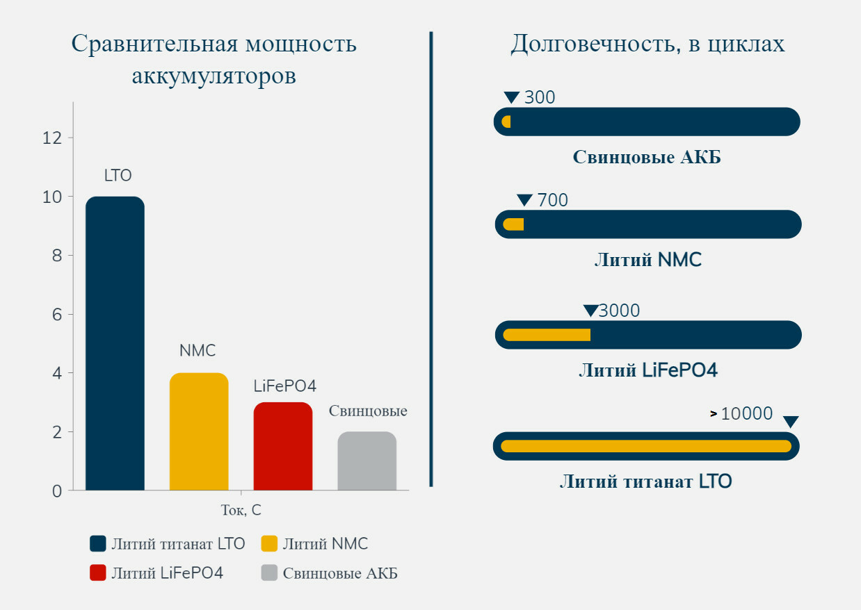 Ngoài ra, chúng bền hơn hàng chục lần so với pin thông thường: ví dụ, pin chì có tuổi thọ khoảng 300-500 chu kỳ, trong khi pin titanate có tuổi thọ lên tới 20 nghìn chu kỳ, hoặc khoảng 25-30 năm hoạt động.