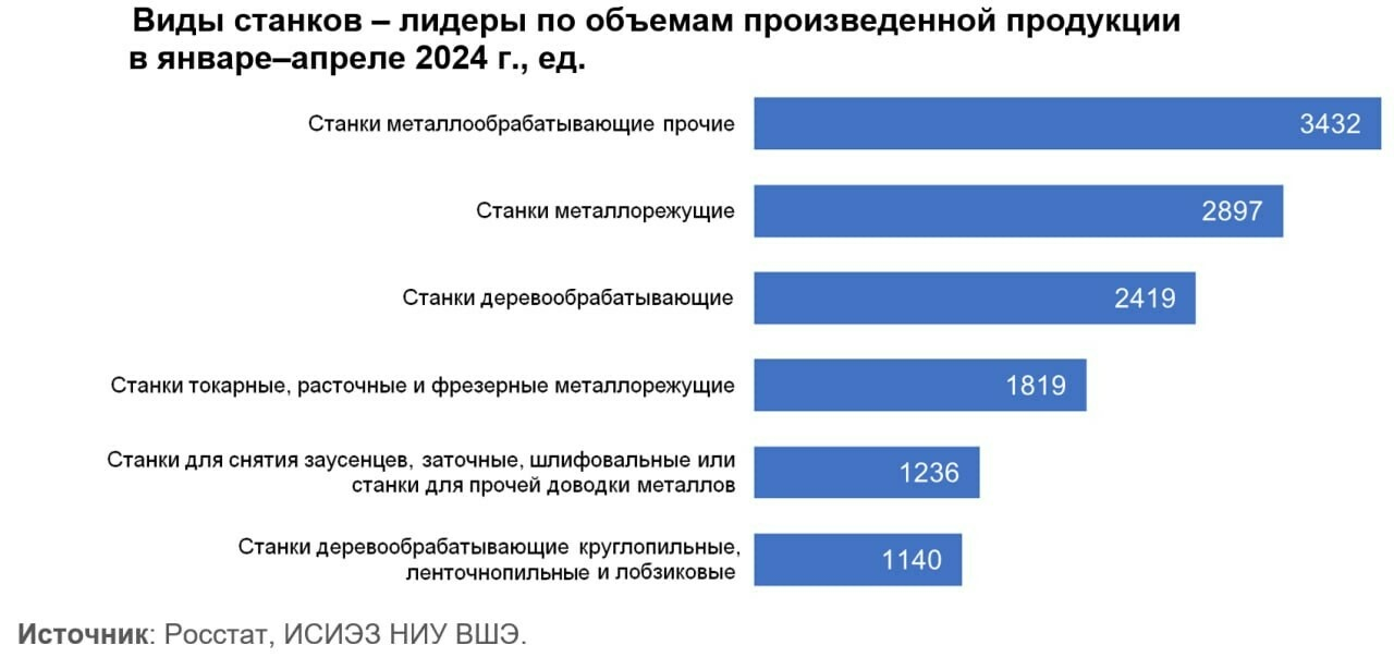 Các nhà chế tạo dẫn đầu về khối lượng sản phẩm sản xuất trong tháng 1-4 năm 2024, so với cùng kỳ năm 2021, cũng là máy gia công kim loại: chúng tăng từ 1,2 lên 3,4 nghìn đơn vị, tức là tăng hơn 2,5 lần;