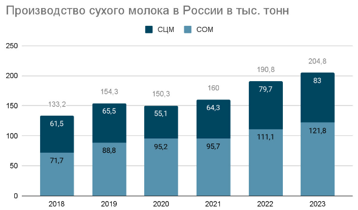 Tăng sản lượng. Trung tâm Phát triển Xuất khẩu Liên bang "Agroexport" thường xuyên tiến hành nghiên cứu về thị trường toàn cầu và Nga. Theo dữ liệu của trung tâm, khối lượng sản xuất sữa bột ở Nga tăng trung bình 7,3% mỗi năm. Trong năm năm qua, sản lượng đã tăng 1,5 lần - từ 133,2 nghìn tấn năm 2018 lên 204,8 nghìn tấn năm 2023. Mức tăng lớn nhất là vào năm 2022 - tăng 19,2%.